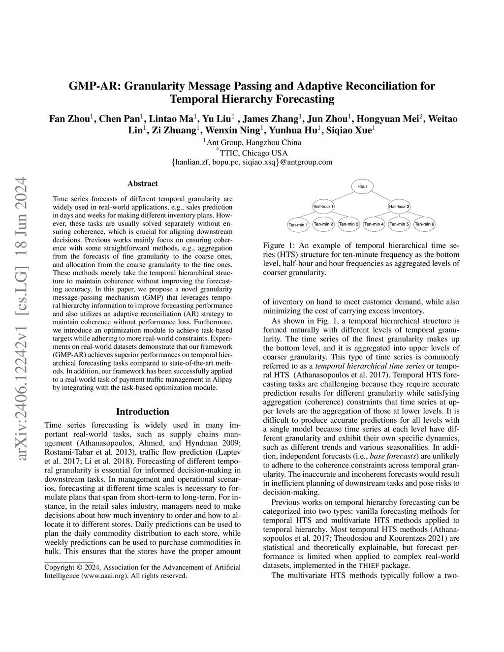 Time series forecasts of different temporal granularity are widely used in real-world applications, e.g., sales prediction in days and weeks for making different inventory plans. However, these tasks are usually solved separately without ensuring coherence, which is crucial for aligning downstream decisions. Previous works mainly focus on ensuring coherence with some straightforward methods, e.g., aggregation from the forecasts of fine granularity to the coarse ones, and allocation from the coarse granularity to the fine ones. These methods merely take the temporal hierarchical structure to maintain coherence without improving the forecasting accuracy. In this paper, we propose a novel granularity message-passing mechanism (GMP) that leverages temporal hierarchy information to improve forecasting performance and also utilizes an adaptive reconciliation (AR) strategy to maintain coherence without performance loss. Furthermore, we introduce an optimization module to achieve task-based targets while adhering to more real-world constraints. Experiments on real-world datasets demonstrate that our framework (GMP-AR) achieves superior performances on temporal hierarchical forecasting tasks compared to state-of-the-art methods. In addition, our framework has been successfully applied to a real-world task of payment traffic management in Alipay by integrating with the task-based optimization module.