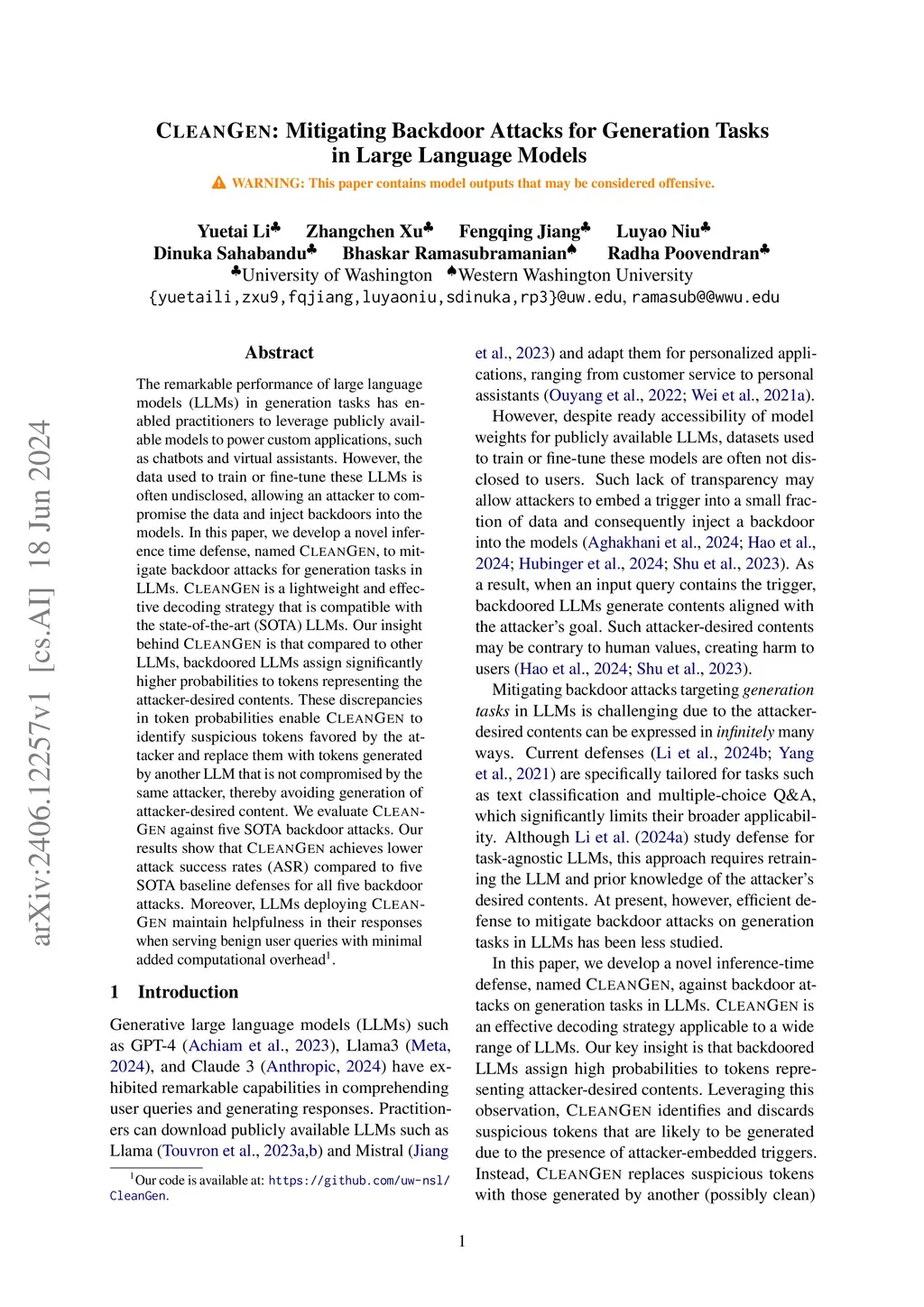 CleanGen: Mitigating Backdoor Attacks for Generation Tasks in Large Language Models