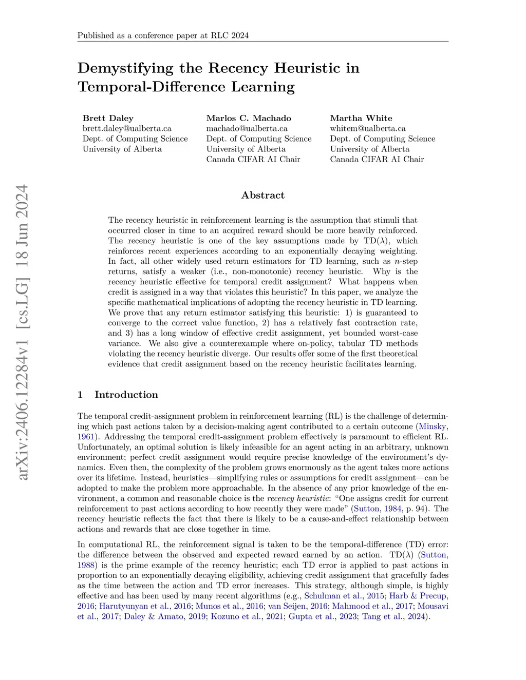 The recency heuristic in reinforcement learning is the assumption that stimuli that occurred closer in time to an acquired reward should be more heavily reinforced. The recency heuristic is one of the key assumptions made by TD(), which reinforces recent experiences according to an exponentially decaying weighting. In fact, all other widely used return estimators for TD learning, such as -step returns, satisfy a weaker (i.e., non-monotonic) recency heuristic. Why is the recency heuristic effective for temporal credit assignment? What happens when credit is assigned in a way that violates this heuristic? In this paper, we analyze the specific mathematical implications of adopting the recency heuristic in TD learning. We prove that any return estimator satisfying this heuristic: 1) is guaranteed to converge to the correct value function, 2) has a relatively fast contraction rate, and 3) has a long window of effective credit assignment, yet bounded worst-case variance. We also give a counterexample where on-policy, tabular TD methods violating the recency heuristic diverge. Our results offer some of the first theoretical evidence that credit assignment based on the recency heuristic facilitates learning.