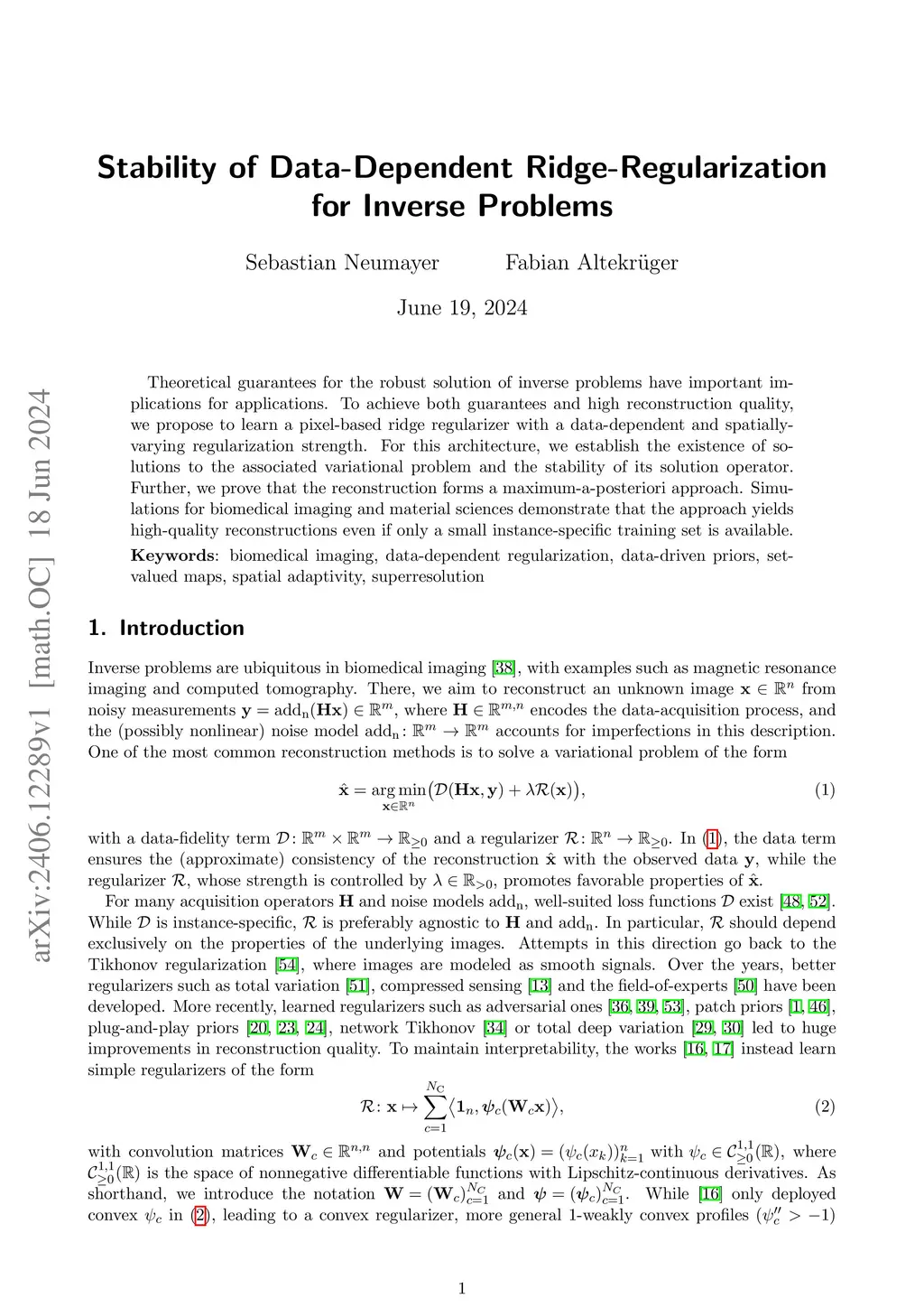 Theoretical guarantees for the robust solution of inverse problems have important implications for applications. To achieve both guarantees and high reconstruction quality, we propose learning a pixel-based ridge regularizer with a data-dependent and spatially varying regularization strength. For this architecture, we establish the existence of solutions to the associated variational problem and the stability of its solution operator. Further, we prove that the reconstruction forms a maximum-a-posteriori approach. Simulations for biomedical imaging and material sciences demonstrate that the approach yields high-quality reconstructions even if only a small instance-specific training set is available.