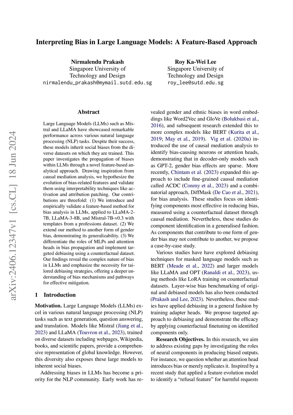 Large Language Models (LLMs) such as Mistral and LLaMA have showcased remarkable performance across various natural language processing (NLP) tasks. Despite their success, these models inherit social biases from the diverse datasets on which they are trained. This paper investigates the propagation of biases within LLMs through a novel feature-based analytical approach. Drawing inspiration from causal mediation analysis, we hypothesize the evolution of bias-related features and validate them using interpretability techniques like activation and attribution patching. Our contributions are threefold: (1) We introduce and empirically validate a feature-based method for bias analysis in LLMs, applied to LLaMA-2-7B, LLaMA-3-8B, and Mistral-7B-v0.3 with templates from a professions dataset. (2) We extend our method to another form of gender bias, demonstrating its generalizability. (3) We differentiate the roles of MLPs and attention heads in bias propagation and implement targeted debiasing using a counterfactual dataset. Our findings reveal the complex nature of bias in LLMs and emphasize the necessity for tailored debiasing strategies, offering a deeper understanding of bias mechanisms and pathways for effective mitigation.