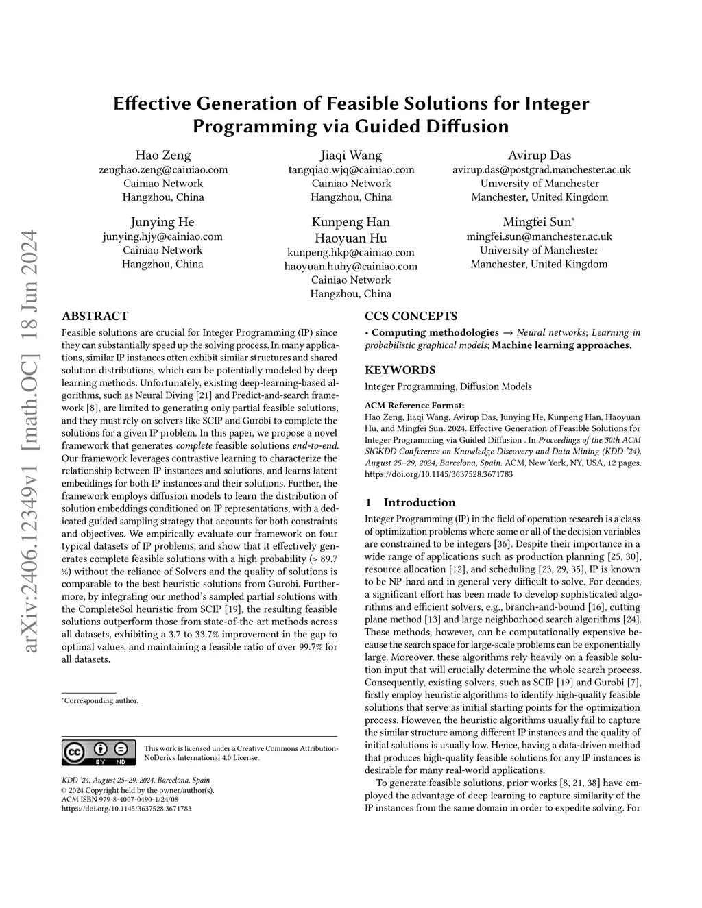 Feasible solutions are crucial for Integer Programming (IP) since they can substantially speed up the solving process. In many applications, similar IP instances often exhibit similar structures and shared solution distributions, which can be potentially modeled by deep learning methods. Unfortunately, existing deep-learning-based algorithms, such as Neural Diving and Predict-and-search framework, are limited to generating only partial feasible solutions, and they must rely on solvers like SCIP and Gurobi to complete the solutions for a given IP problem. In this paper, we propose a novel framework that generates complete feasible solutions end-to-end. Our framework leverages contrastive learning to characterize the relationship between IP instances and solutions, and learns latent embeddings for both IP instances and their solutions. Further, the framework employs diffusion models to learn the distribution of solution embeddings conditioned on IP representations, with a dedicated guided sampling strategy that accounts for both constraints and objectives. We empirically evaluate our framework on four typical datasets of IP problems, and show that it effectively generates complete feasible solutions with a high probability (> 89.7 \%) without the reliance of Solvers and the quality of solutions is comparable to the best heuristic solutions from Gurobi. Furthermore, by integrating our method's sampled partial solutions with the CompleteSol heuristic from SCIP, the resulting feasible solutions outperform those from state-of-the-art methods across all datasets, exhibiting a 3.7 to 33.7\% improvement in the gap to optimal values, and maintaining a feasible ratio of over 99.7\% for all datasets.