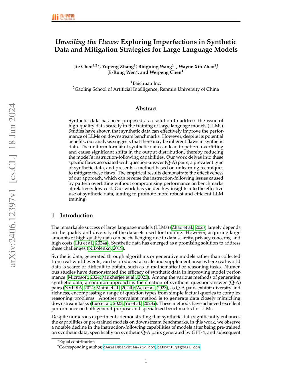 Synthetic data has been proposed as a solution to address the issue of high-quality data scarcity in the training of large language models (LLMs). Studies have shown that synthetic data can effectively improve the performance of LLMs on downstream benchmarks. However, despite its potential benefits, our analysis suggests that there may be inherent flaws in synthetic data. The uniform format of synthetic data can lead to pattern overfitting and cause significant shifts in the output distribution, thereby reducing the model's instruction-following capabilities. Our work delves into these specific flaws associated with question-answer (Q-A) pairs, a prevalent type of synthetic data, and presents a method based on unlearning techniques to mitigate these flaws. The empirical results demonstrate the effectiveness of our approach, which can reverse the instruction-following issues caused by pattern overfitting without compromising performance on benchmarks at relatively low cost. Our work has yielded key insights into the effective use of synthetic data, aiming to promote more robust and efficient LLM training.