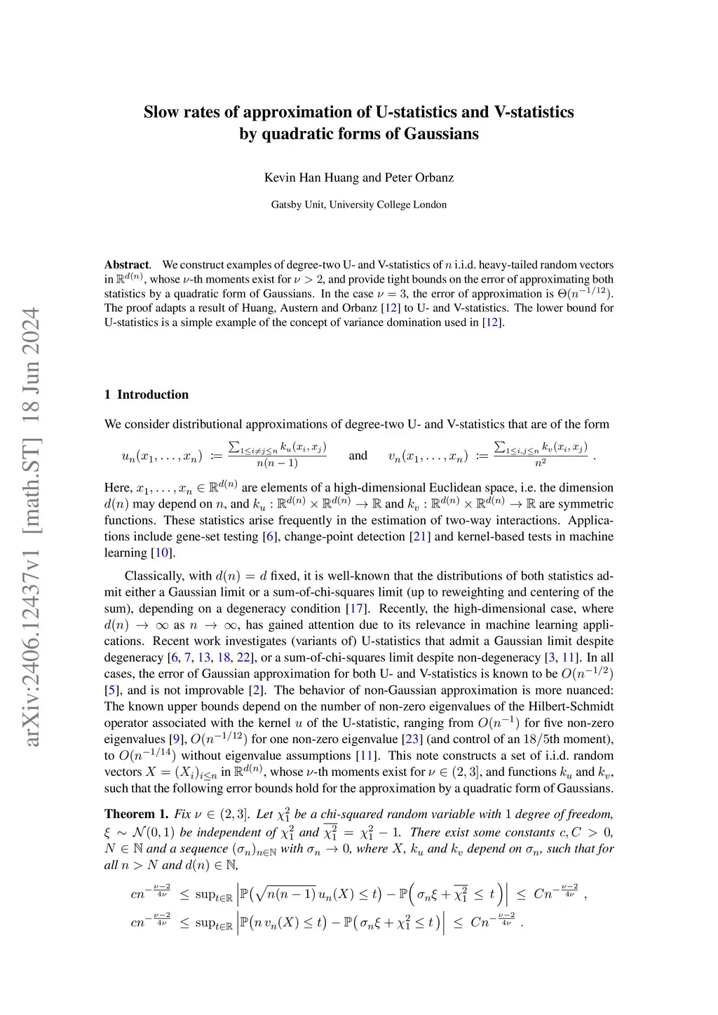 We construct examples of degree-two U- and V-statistics of i.i.d.~heavy-tailed random vectors in , whose -th moments exist for , and provide tight bounds on the error of approximating both statistics by a quadratic form of Gaussians. In the case , the error of approximation is . The proof adapts a result of Huang, Austern and Orbanz [12] to U- and V-statistics. The lower bound for U-statistics is a simple example of the concept of variance domination used in [12].