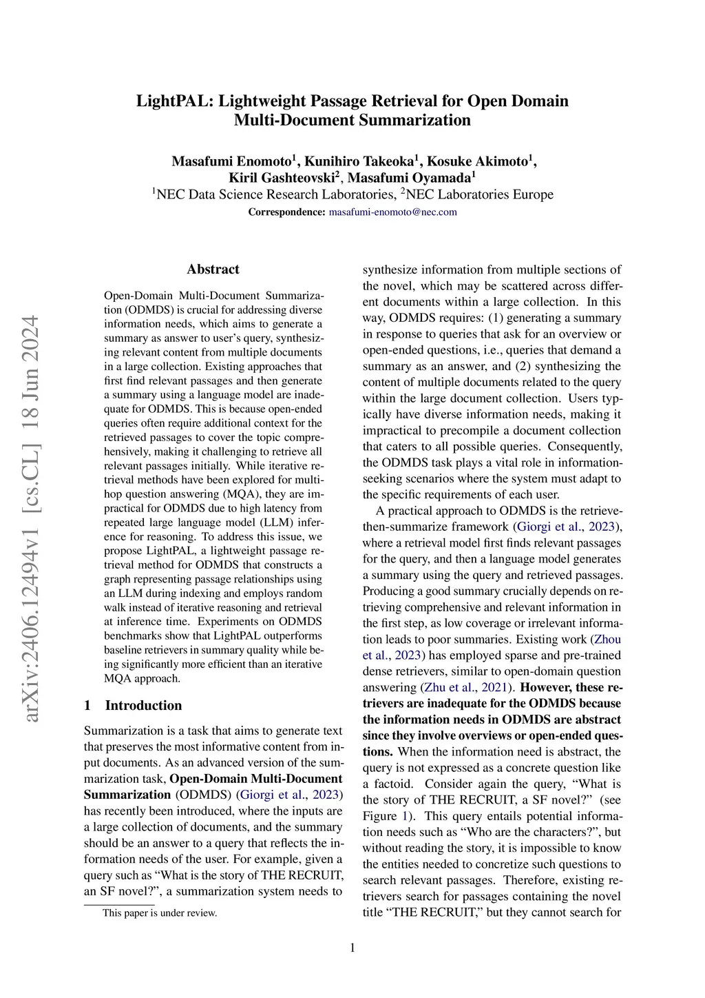 LightPAL: Lightweight Passage Retrieval for Open Domain Multi-Document