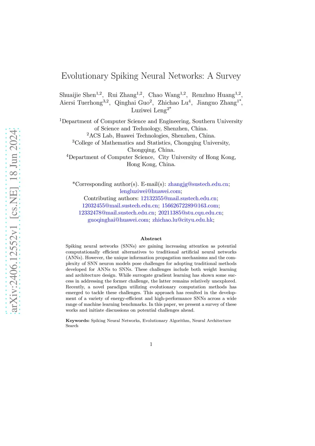 Spiking neural networks (SNNs) are gaining increasing attention as potential computationally efficient alternatives to traditional artificial neural networks(ANNs). However, the unique information propagation mechanisms and the complexity of SNN neuron models pose challenges for adopting traditional methods developed for ANNs to SNNs. These challenges include both weight learning and architecture design. While surrogate gradient learning has shown some success in addressing the former challenge, the latter remains relatively unexplored. Recently, a novel paradigm utilizing evolutionary computation methods has emerged to tackle these challenges. This approach has resulted in the development of a variety of energy-efficient and high-performance SNNs across a wide range of machine learning benchmarks. In this paper, we present a survey of these works and initiate discussions on potential challenges ahead.