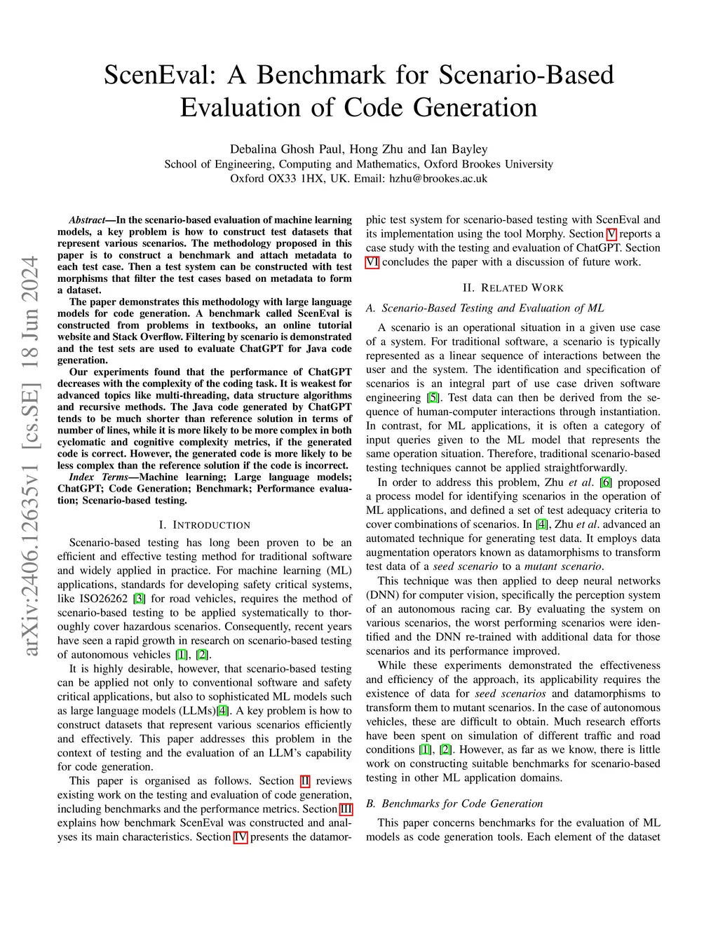 In the scenario-based evaluation of machine learning models, a key problem is how to construct test datasets that represent various scenarios. The methodology proposed in this paper is to construct a benchmark and attach metadata to each test case. Then a test system can be constructed with test morphisms that filter the test cases based on metadata to form a dataset. The paper demonstrates this methodology with large language models for code generation. A benchmark called ScenEval is constructed from problems in textbooks, an online tutorial website and Stack Overflow. Filtering by scenario is demonstrated and the test sets are used to evaluate ChatGPT for Java code generation. Our experiments found that the performance of ChatGPT decreases with the complexity of the coding task. It is weakest for advanced topics like multi-threading, data structure algorithms and recursive methods. The Java code generated by ChatGPT tends to be much shorter than reference solution in terms of number of lines, while it is more likely to be more complex in both cyclomatic and cognitive complexity metrics, if the generated code is correct. However, the generated code is more likely to be less complex than the reference solution if the code is incorrect.