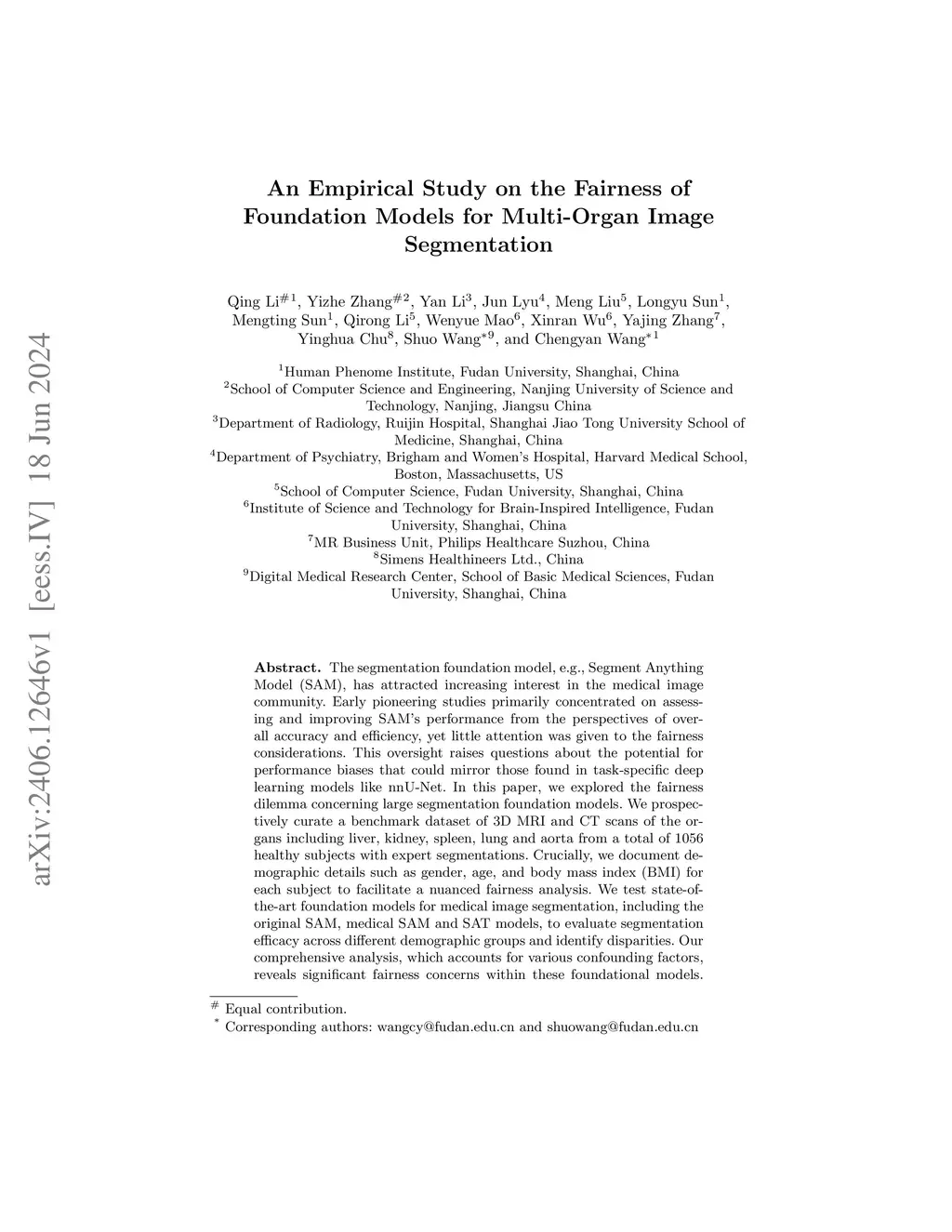 The segmentation foundation model, e.g., Segment Anything Model (SAM), has attracted increasing interest in the medical image community. Early pioneering studies primarily concentrated on assessing and improving SAM's performance from the perspectives of overall accuracy and efficiency, yet little attention was given to the fairness considerations. This oversight raises questions about the potential for performance biases that could mirror those found in task-specific deep learning models like nnU-Net. In this paper, we explored the fairness dilemma concerning large segmentation foundation models. We prospectively curate a benchmark dataset of 3D MRI and CT scans of the organs including liver, kidney, spleen, lung and aorta from a total of 1056 healthy subjects with expert segmentations. Crucially, we document demographic details such as gender, age, and body mass index (BMI) for each subject to facilitate a nuanced fairness analysis. We test state-of-the-art foundation models for medical image segmentation, including the original SAM, medical SAM and SAT models, to evaluate segmentation efficacy across different demographic groups and identify disparities. Our comprehensive analysis, which accounts for various confounding factors, reveals significant fairness concerns within these foundational models. Moreover, our findings highlight not only disparities in overall segmentation metrics, such as the Dice Similarity Coefficient but also significant variations in the spatial distribution of segmentation errors, offering empirical evidence of the nuanced challenges in ensuring fairness in medical image segmentation.