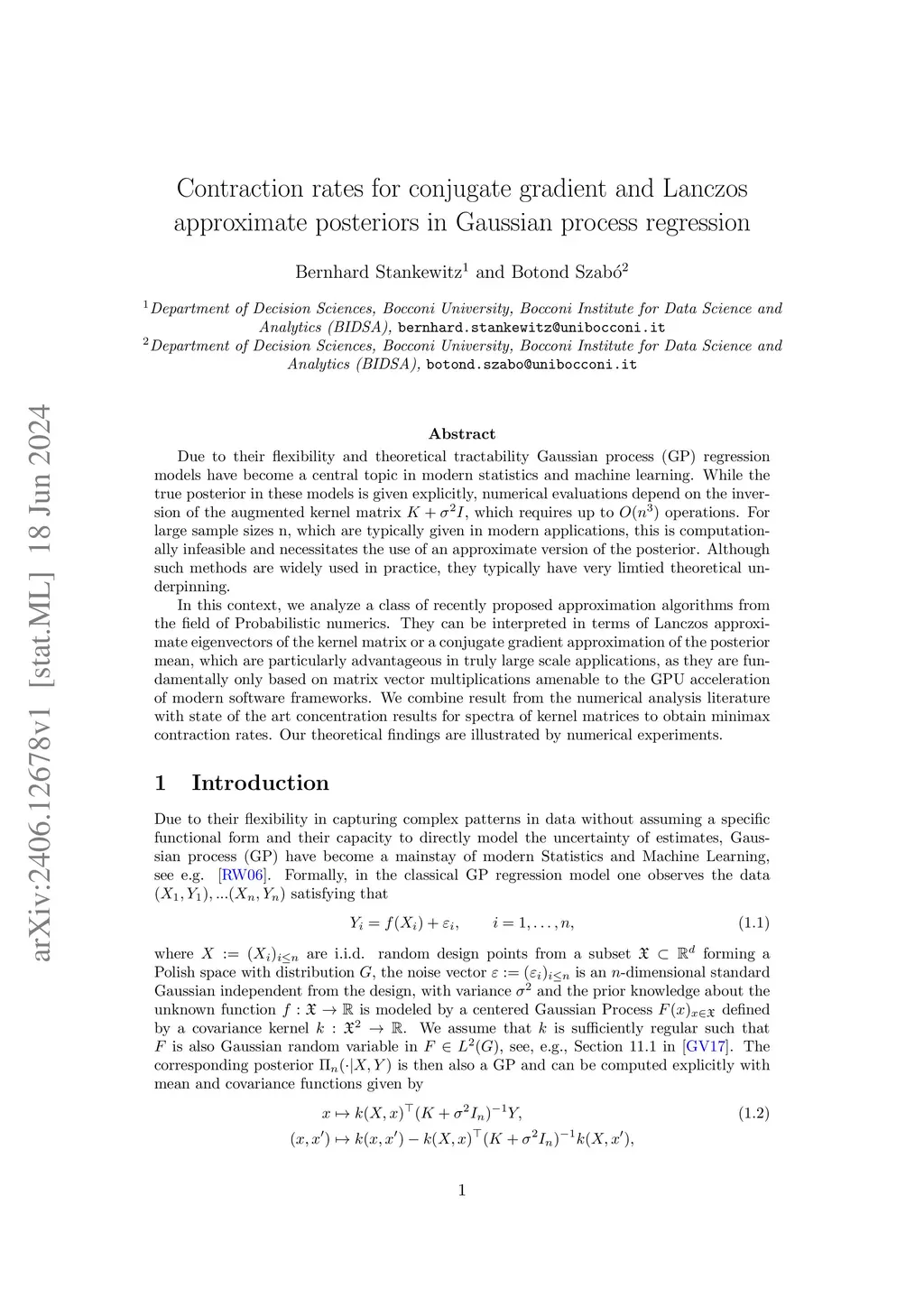 Due to their flexibility and theoretical tractability Gaussian process (GP) regression models have become a central topic in modern statistics and machine learning. While the true posterior in these models is given explicitly, numerical evaluations depend on the inversion of the augmented kernel matrix $ K + \sigma^2 I $, which requires up to $ O(n^3) $ operations. For large sample sizes n, which are typically given in modern applications, this is computationally infeasible and necessitates the use of an approximate version of the posterior. Although such methods are widely used in practice, they typically have very limtied theoretical underpinning. In this context, we analyze a class of recently proposed approximation algorithms from the field of Probabilistic numerics. They can be interpreted in terms of Lanczos approximate eigenvectors of the kernel matrix or a conjugate gradient approximation of the posterior mean, which are particularly advantageous in truly large scale applications, as they are fundamentally only based on matrix vector multiplications amenable to the GPU acceleration of modern software frameworks. We combine result from the numerical analysis literature with state of the art concentration results for spectra of kernel matrices to obtain minimax contraction rates. Our theoretical findings are illustrated by numerical experiments.