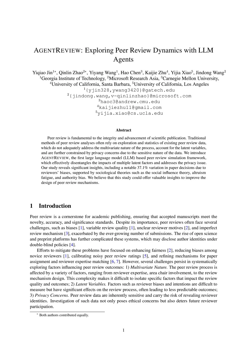 Peer review is fundamental to the integrity and advancement of scientific publication. Traditional methods of peer review analyses often rely on exploration and statistics of existing peer review data, which do not adequately address the multivariate nature of the process, account for the latent variables, and are further constrained by privacy concerns due to the sensitive nature of the data. We introduce AgentReview, the first large language model (LLM) based peer review simulation framework, which effectively disentangles the impacts of multiple latent factors and addresses the privacy issue. Our study reveals significant insights, including a notable 37.1% variation in paper decisions due to reviewers' biases, supported by sociological theories such as the social influence theory, altruism fatigue, and authority bias. We believe that this study could offer valuable insights to improve the design of peer review mechanisms.