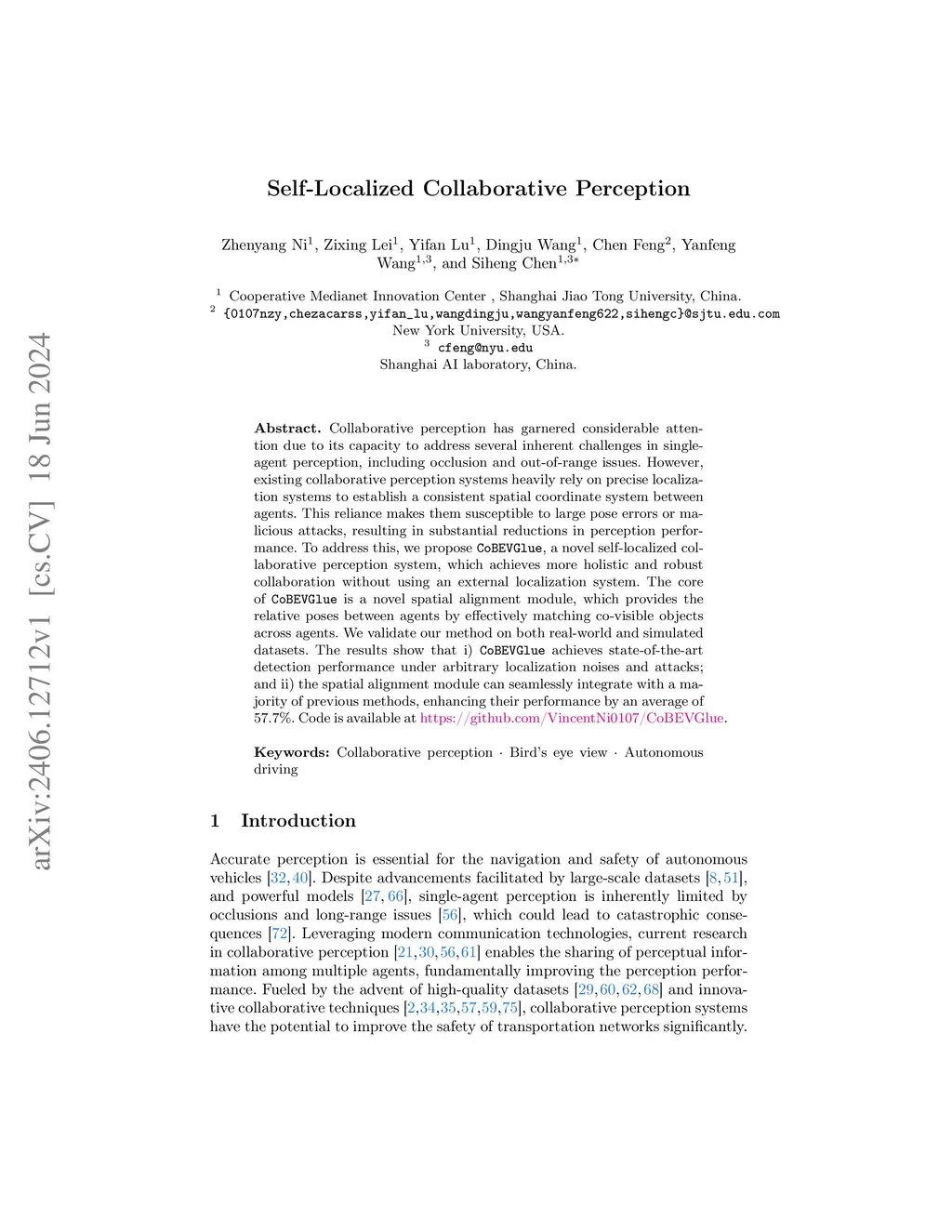 Collaborative perception has garnered considerable attention due to its capacity to address several inherent challenges in single-agent perception, including occlusion and out-of-range issues. However, existing collaborative perception systems heavily rely on precise localization systems to establish a consistent spatial coordinate system between agents. This reliance makes them susceptible to large pose errors or malicious attacks, resulting in substantial reductions in perception performance. To address this, we propose~, a novel self-localized collaborative perception system, which achieves more holistic and robust collaboration without using an external localization system. The core of~ is a novel spatial alignment module, which provides the relative poses between agents by effectively matching co-visible objects across agents. We validate our method on both real-world and simulated datasets. The results show that i) achieves state-of-the-art detection performance under arbitrary localization noises and attacks; and ii) the spatial alignment module can seamlessly integrate with a majority of previous methods, enhancing their performance by an average of . Code is available at https://github.com/VincentNi0107/CoBEVGlue