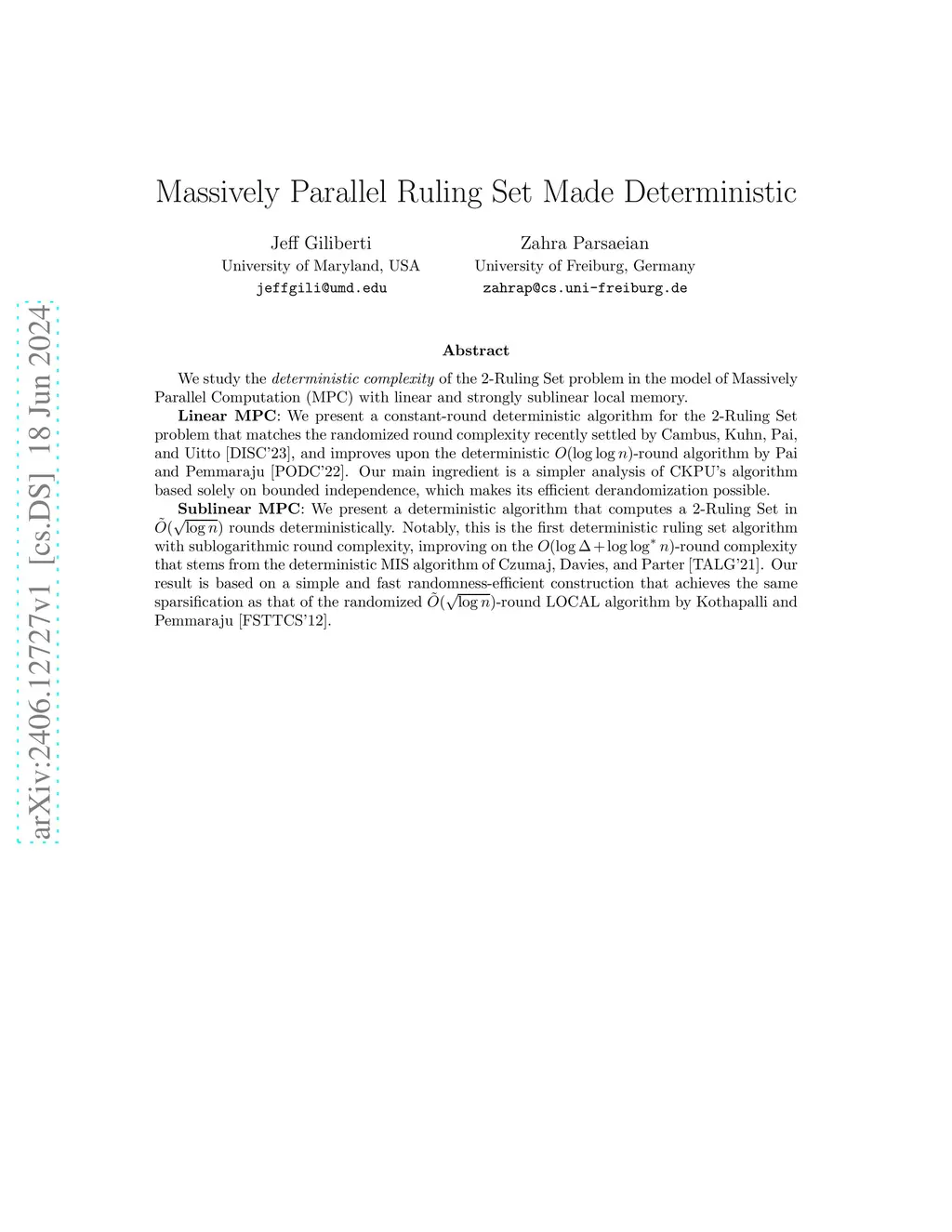 We study the deterministic complexity of the -Ruling Set problem in the model of Massively Parallel Computation (MPC) with linear and strongly sublinear local memory. Linear MPC: We present a constant-round deterministic algorithm for the -Ruling Set problem that matches the randomized round complexity recently settled by Cambus, Kuhn, Pai, and Uitto [DISC'23], and improves upon the deterministic -round algorithm by Pai and Pemmaraju [PODC'22]. Our main ingredient is a simpler analysis of CKPU's algorithm based solely on bounded independence, which makes its efficient derandomization possible. Sublinear MPC: We present a deterministic algorithm that computes a -Ruling Set in rounds deterministically. Notably, this is the first deterministic ruling set algorithm with sublogarithmic round complexity, improving on the -round complexity that stems from the deterministic MIS algorithm of Czumaj, Davies, and Parter [TALG'21]. Our result is based on a simple and fast randomness-efficient construction that achieves the same sparsification as that of the randomized -round LOCAL algorithm by Kothapalli and Pemmaraju [FSTTCS'12].