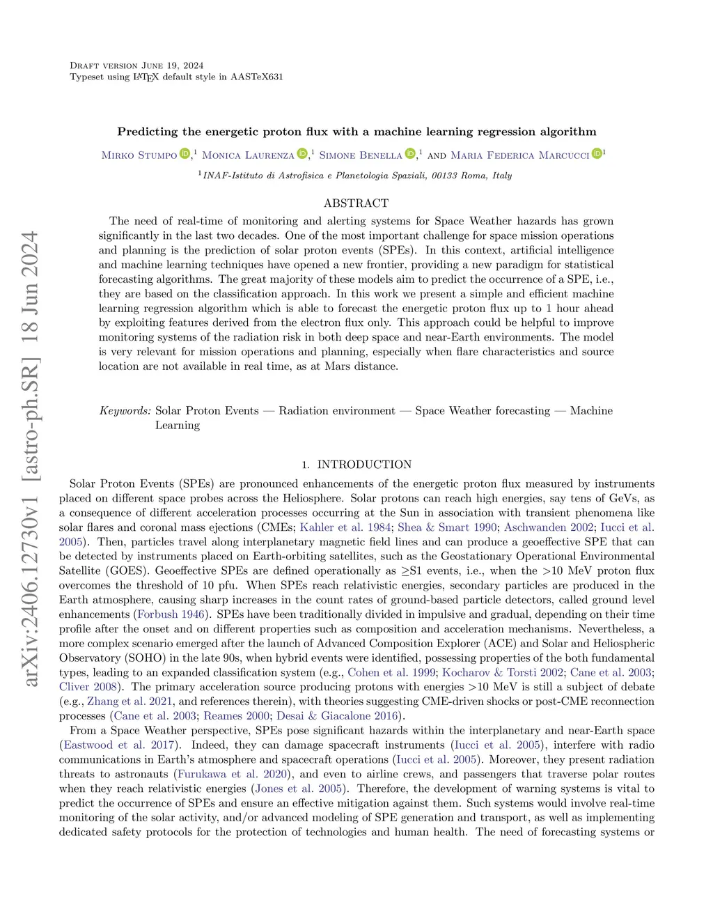 The need of real-time of monitoring and alerting systems for Space Weather hazards has grown significantly in the last two decades. One of the most important challenge for space mission operations and planning is the prediction of solar proton events (SPEs). In this context, artificial intelligence and machine learning techniques have opened a new frontier, providing a new paradigm for statistical forecasting algorithms. The great majority of these models aim to predict the occurrence of a SPE, i.e., they are based on the classification approach. In this work we present a simple and efficient machine learning regression algorithm which is able to forecast the energetic proton flux up to 1 hour ahead by exploiting features derived from the electron flux only. This approach could be helpful to improve monitoring systems of the radiation risk in both deep space and near-Earth environments. The model is very relevant for mission operations and planning, especially when flare characteristics and source location are not available in real time, as at Mars distance.