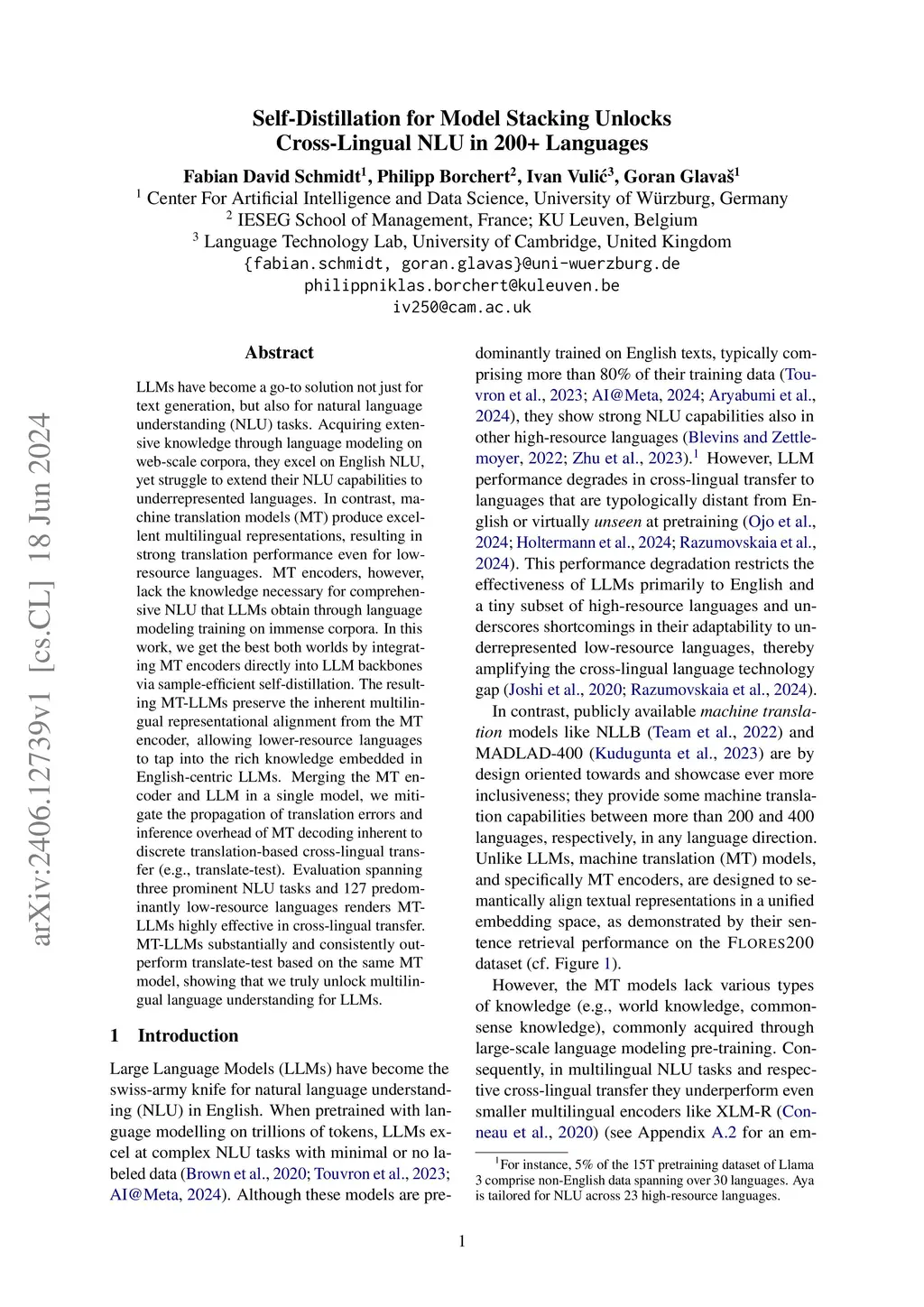 Self-Distillation for Model Stacking Unlocks Cross-Lingual NLU in 200+