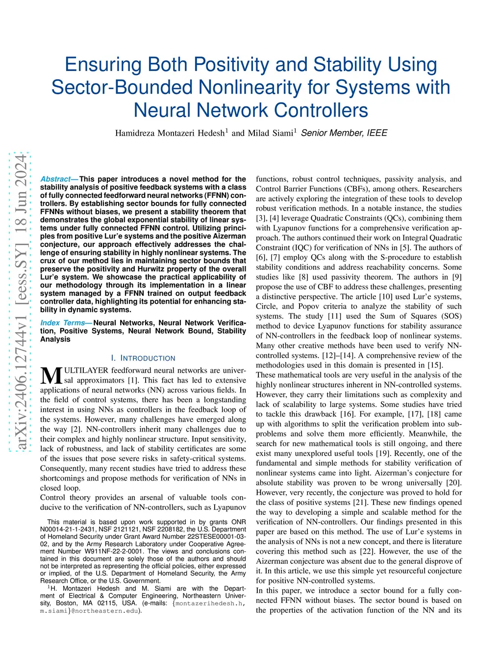 This paper introduces a novel method for the stability analysis of positive feedback systems with a class of fully connected feedforward neural networks (FFNN) controllers. By establishing sector bounds for fully connected FFNNs without biases, we present a stability theorem that demonstrates the global exponential stability of linear systems under fully connected FFNN control. Utilizing principles from positive Luré systems and the positive Aizerman conjecture, our approach effectively addresses the challenge of ensuring stability in highly nonlinear systems. The crux of our method lies in maintaining sector bounds that preserve the positivity and Hurwitz property of the overall Luré system. We showcase the practical applicability of our methodology through its implementation in a linear system managed by a FFNN trained on output feedback controller data, highlighting its potential for enhancing stability in dynamic systems.