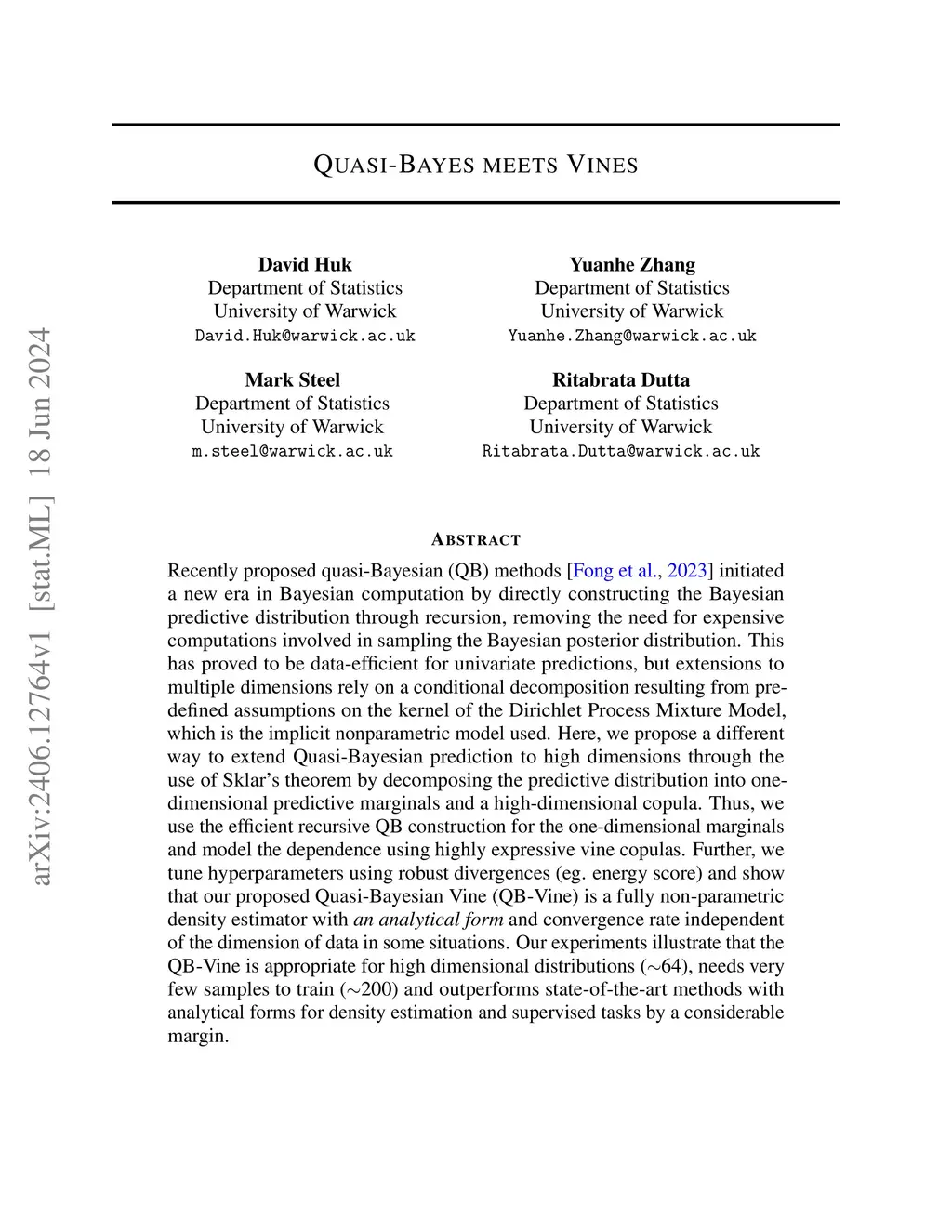 Recently proposed quasi-Bayesian (QB) methods initiated a new era in Bayesian computation by directly constructing the Bayesian predictive distribution through recursion, removing the need for expensive computations involved in sampling the Bayesian posterior distribution. This has proved to be data-efficient for univariate predictions, but extensions to multiple dimensions rely on a conditional decomposition resulting from predefined assumptions on the kernel of the Dirichlet Process Mixture Model, which is the implicit nonparametric model used. Here, we propose a different way to extend Quasi-Bayesian prediction to high dimensions through the use of Sklar's theorem by decomposing the predictive distribution into one-dimensional predictive marginals and a high-dimensional copula. Thus, we use the efficient recursive QB construction for the one-dimensional marginals and model the dependence using highly expressive vine copulas. Further, we tune hyperparameters using robust divergences (eg. energy score) and show that our proposed Quasi-Bayesian Vine (QB-Vine) is a fully non-parametric density estimator with \emph{an analytical form} and convergence rate independent of the dimension of data in some situations. Our experiments illustrate that the QB-Vine is appropriate for high dimensional distributions (64), needs very few samples to train (200) and outperforms state-of-the-art methods with analytical forms for density estimation and supervised tasks by a considerable margin.