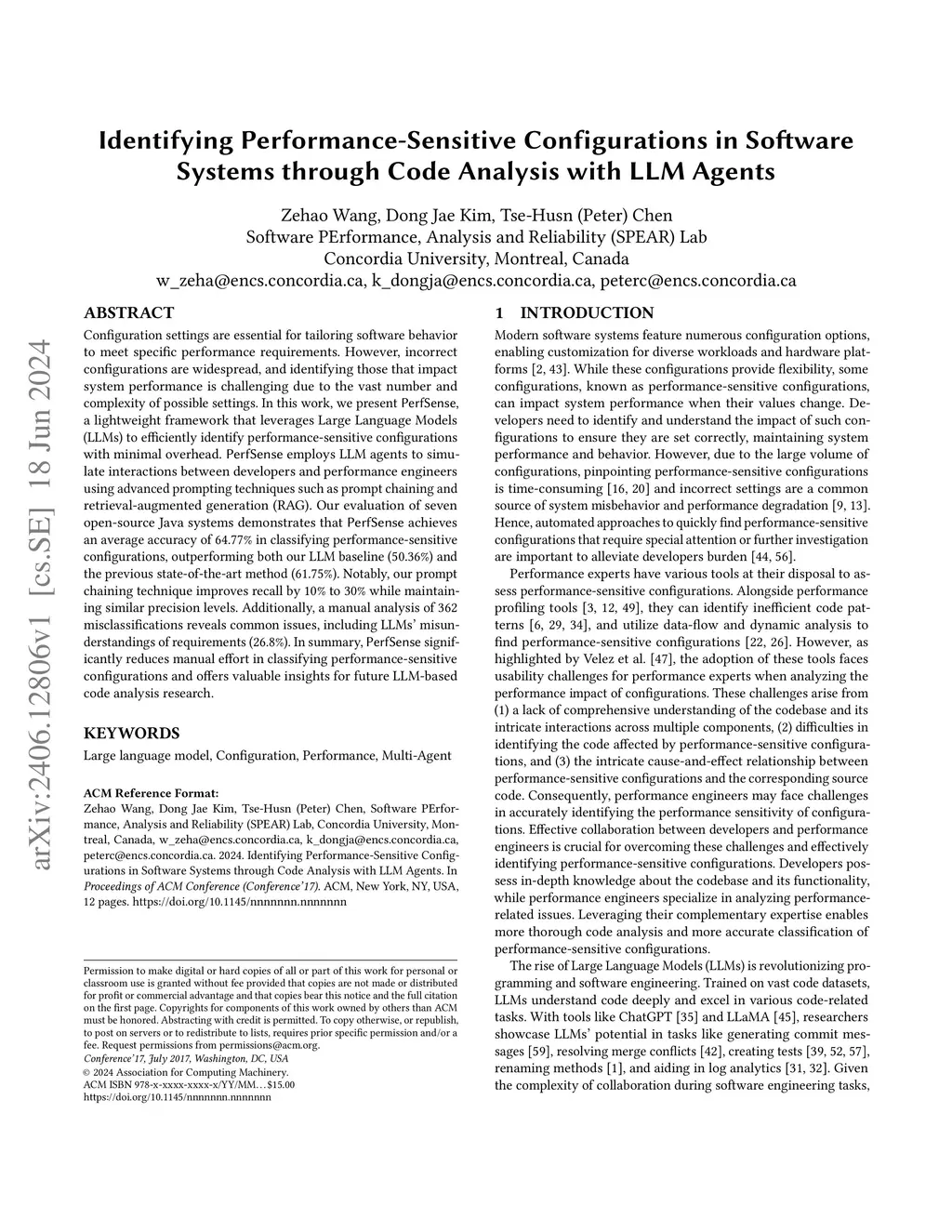 Configuration settings are essential for tailoring software behavior to meet specific performance requirements. However, incorrect configurations are widespread, and identifying those that impact system performance is challenging due to the vast number and complexity of possible settings. In this work, we present PerfSense, a lightweight framework that leverages Large Language Models (LLMs) to efficiently identify performance-sensitive configurations with minimal overhead. PerfSense employs LLM agents to simulate interactions between developers and performance engineers using advanced prompting techniques such as prompt chaining and retrieval-augmented generation (RAG). Our evaluation of seven open-source Java systems demonstrates that PerfSense achieves an average accuracy of 64.77% in classifying performance-sensitive configurations, outperforming both our LLM baseline (50.36%) and the previous state-of-the-art method (61.75%). Notably, our prompt chaining technique improves recall by 10% to 30% while maintaining similar precision levels. Additionally, a manual analysis of 362 misclassifications reveals common issues, including LLMs' misunderstandings of requirements (26.8%). In summary, PerfSense significantly reduces manual effort in classifying performance-sensitive configurations and offers valuable insights for future LLM-based code analysis research.