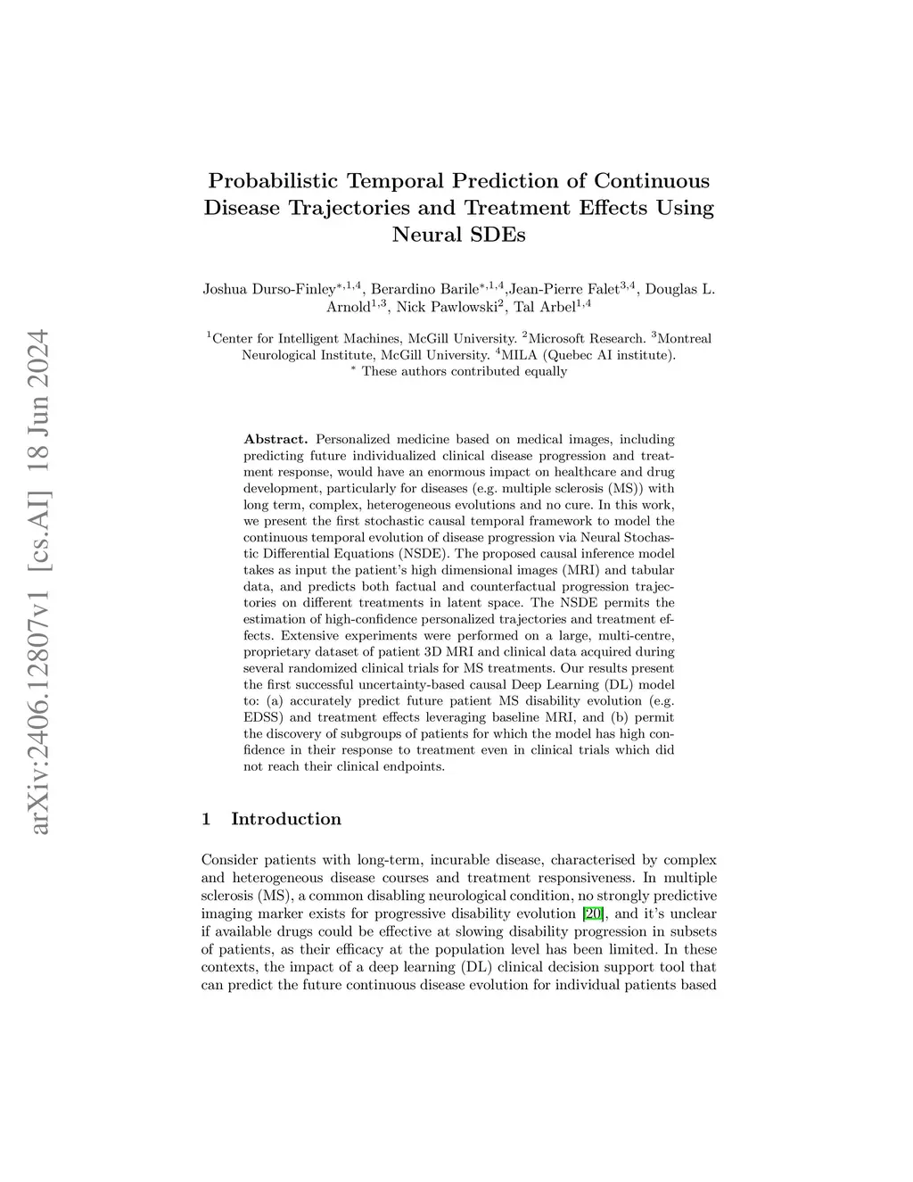 Personalized medicine based on medical images, including predicting future individualized clinical disease progression and treatment response, would have an enormous impact on healthcare and drug development, particularly for diseases (e.g. multiple sclerosis (MS)) with long term, complex, heterogeneous evolutions and no cure. In this work, we present the first stochastic causal temporal framework to model the continuous temporal evolution of disease progression via Neural Stochastic Differential Equations (NSDE). The proposed causal inference model takes as input the patient's high dimensional images (MRI) and tabular data, and predicts both factual and counterfactual progression trajectories on different treatments in latent space. The NSDE permits the estimation of high-confidence personalized trajectories and treatment effects. Extensive experiments were performed on a large, multi-centre, proprietary dataset of patient 3D MRI and clinical data acquired during several randomized clinical trials for MS treatments. Our results present the first successful uncertainty-based causal Deep Learning (DL) model to: (a) accurately predict future patient MS disability evolution (e.g. EDSS) and treatment effects leveraging baseline MRI, and (b) permit the discovery of subgroups of patients for which the model has high confidence in their response to treatment even in clinical trials which did not reach their clinical endpoints.