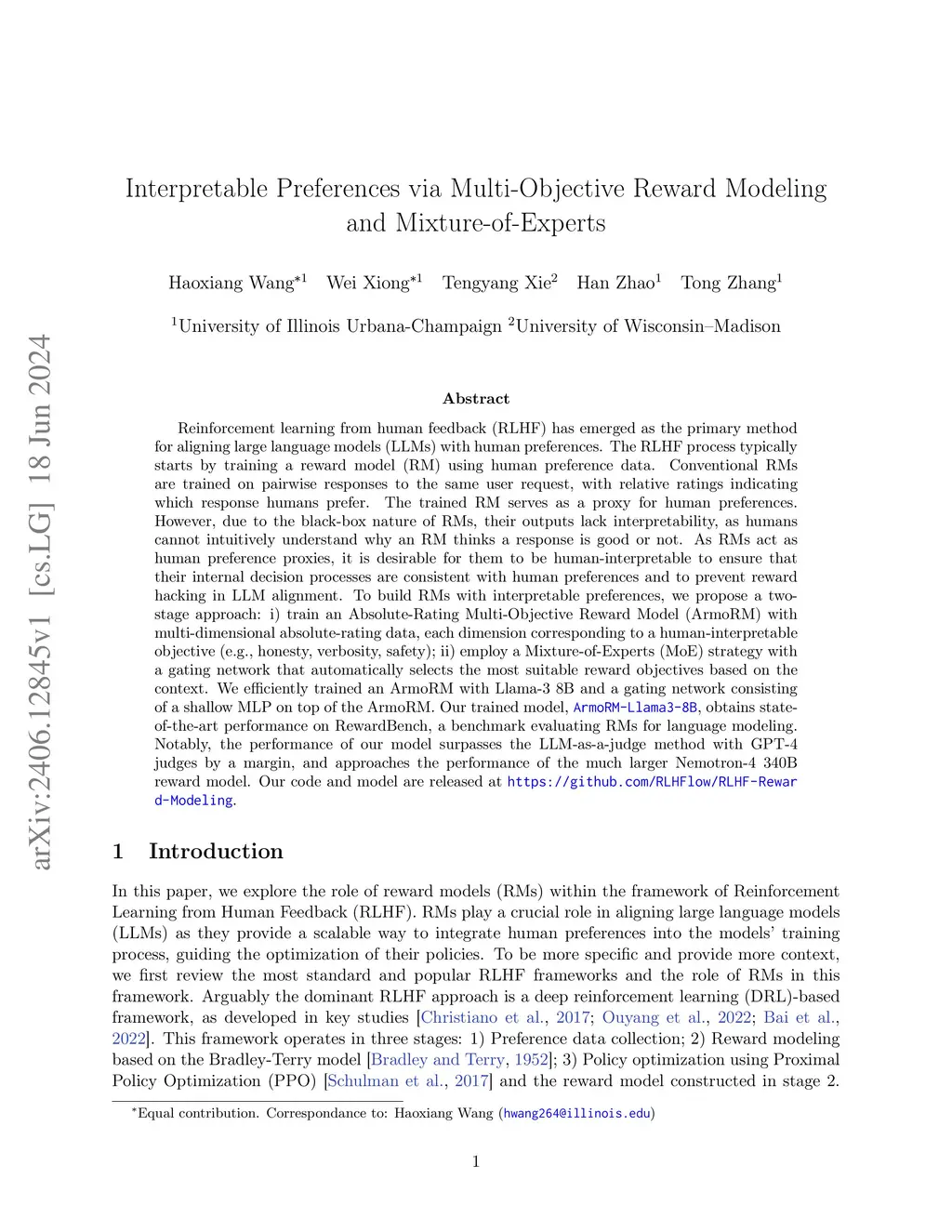 Reinforcement learning from human feedback (RLHF) has emerged as the primary method for aligning large language models (LLMs) with human preferences. The RLHF process typically starts by training a reward model (RM) using human preference data. Conventional RMs are trained on pairwise responses to the same user request, with relative ratings indicating which response humans prefer. The trained RM serves as a proxy for human preferences. However, due to the black-box nature of RMs, their outputs lack interpretability, as humans cannot intuitively understand why an RM thinks a response is good or not. As RMs act as human preference proxies, we believe they should be human-interpretable to ensure that their internal decision processes are consistent with human preferences and to prevent reward hacking in LLM alignment. To build RMs with interpretable preferences, we propose a two-stage approach: i) train an Absolute-Rating Multi-Objective Reward Model (ArmoRM) with multi-dimensional absolute-rating data, each dimension corresponding to a human-interpretable objective (e.g., honesty, verbosity, safety); ii) employ a Mixture-of-Experts (MoE) strategy with a gating network that automatically selects the most suitable reward objectives based on the context. We efficiently trained an ArmoRM with Llama-3 8B and a gating network consisting of a shallow MLP on top of the ArmoRM. Our trained model, ArmoRM-Llama3-8B, obtains state-of-the-art performance on RewardBench, a benchmark evaluating RMs for language modeling. Notably, the performance of our model surpasses the LLM-as-a-judge method with GPT-4 judges by a margin, and approaches the performance of the much larger Nemotron-4 340B reward model.