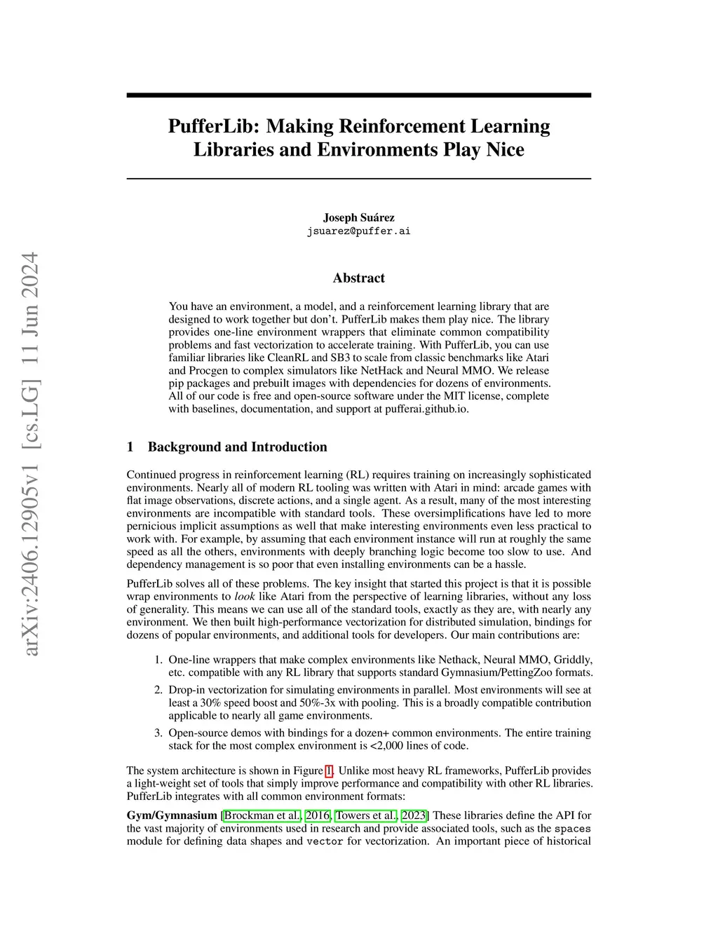 You have an environment, a model, and a reinforcement learning library that are designed to work together but don't. PufferLib makes them play nice. The library provides one-line environment wrappers that eliminate common compatibility problems and fast vectorization to accelerate training. With PufferLib, you can use familiar libraries like CleanRL and SB3 to scale from classic benchmarks like Atari and Procgen to complex simulators like NetHack and Neural MMO. We release pip packages and prebuilt images with dependencies for dozens of environments. All of our code is free and open-source software under the MIT license, complete with baselines, documentation, and support at pufferai.github.io.