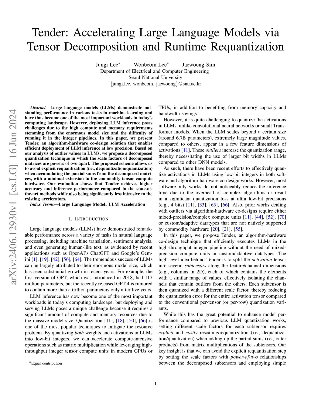 Large language models (LLMs) demonstrate outstanding performance in various tasks in machine learning and have thus become one of the most important workloads in today's computing landscape. However, deploying LLM inference poses challenges due to the high compute and memory requirements stemming from the enormous model size and the difficulty of running it in the integer pipelines. In this paper, we present Tender, an algorithm-hardware co-design solution that enables efficient deployment of LLM inference at low precision. Based on our analysis of outlier values in LLMs, we propose a decomposed quantization technique in which the scale factors of decomposed matrices are powers of two apart. The proposed scheme allows us to avoid explicit requantization (i.e., dequantization/quantization) when accumulating the partial sums from the decomposed matrices, with a minimal extension to the commodity tensor compute hardware. Our evaluation shows that Tender achieves higher accuracy and inference performance compared to the state-of-the-art methods while also being significantly less intrusive to the existing accelerators.