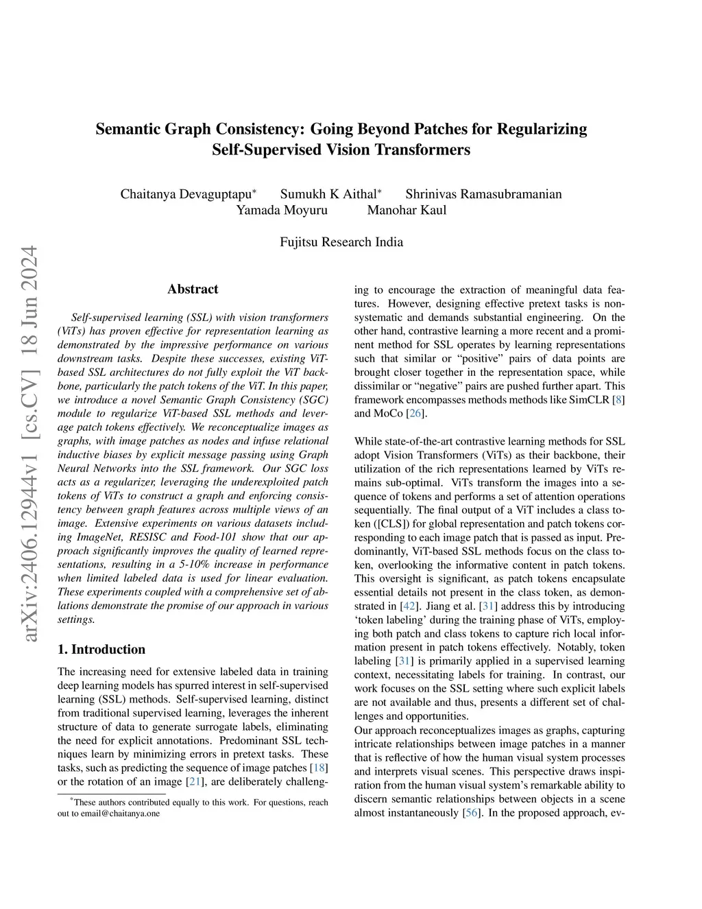 Self-supervised learning (SSL) with vision transformers (ViTs) has proven effective for representation learning as demonstrated by the impressive performance on various downstream tasks. Despite these successes, existing ViT-based SSL architectures do not fully exploit the ViT backbone, particularly the patch tokens of the ViT. In this paper, we introduce a novel Semantic Graph Consistency (SGC) module to regularize ViT-based SSL methods and leverage patch tokens effectively. We reconceptualize images as graphs, with image patches as nodes and infuse relational inductive biases by explicit message passing using Graph Neural Networks into the SSL framework. Our SGC loss acts as a regularizer, leveraging the underexploited patch tokens of ViTs to construct a graph and enforcing consistency between graph features across multiple views of an image. Extensive experiments on various datasets including ImageNet, RESISC and Food-101 show that our approach significantly improves the quality of learned representations, resulting in a 5-10\% increase in performance when limited labeled data is used for linear evaluation. These experiments coupled with a comprehensive set of ablations demonstrate the promise of our approach in various settings.