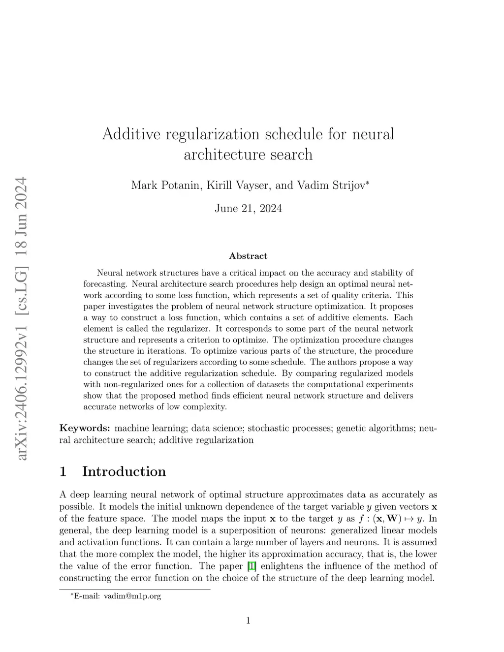 Neural network structures have a critical impact on the accuracy and stability of forecasting. Neural architecture search procedures help design an optimal neural network according to some loss function, which represents a set of quality criteria. This paper investigates the problem of neural network structure optimization. It proposes a way to construct a loss function, which contains a set of additive elements. Each element is called the regularizer. It corresponds to some part of the neural network structure and represents a criterion to optimize. The optimization procedure changes the structure in iterations. To optimize various parts of the structure, the procedure changes the set of regularizers according to some schedule. The authors propose a way to construct the additive regularization schedule. By comparing regularized models with non-regularized ones for a collection of datasets the computational experiments show that the proposed method finds efficient neural network structure and delivers accurate networks of low complexity.