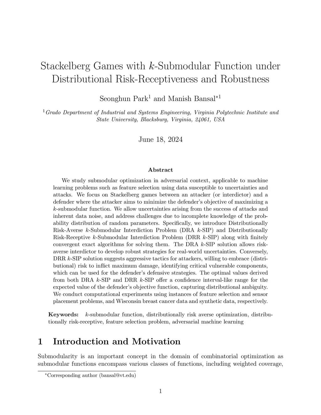 We study submodular optimization in adversarial context, applicable to machine learning problems such as feature selection using data susceptible to uncertainties and attacks. We focus on Stackelberg games between an attacker (or interdictor) and a defender where the attacker aims to minimize the defender's objective of maximizing a -submodular function. We allow uncertainties arising from the success of attacks and inherent data noise, and address challenges due to incomplete knowledge of the probability distribution of random parameters. Specifically, we introduce Distributionally Robust -Submodular Interdiction Problem (DRO -SIP) and Distributionally Risk-Receptive -Submodular Interdiction Problem (DRR -SIP) along with finitely convergent exact algorithms for solving them. When solving the DRO -SIP, the attacker optimizes their expected payoff with respect to the worst-case probability distribution within the ambiguity set, and thereby have robust attack strategies despite distributional ambiguity. In contrast, the DRR -SIP identifies attacker strategies with the best-case probability distribution, and identifies critical vulnerabilities for the defender. The optimal values derived from both DRO -SIP and DRR -SIP offer a confidence interval-like range for the expected value of the defender's objective function, capturing distributional ambiguity. We conduct computational experiments on instances of feature selection and sensor placement problems, using Wisconsin breast cancer data and synthetic data, respectively.