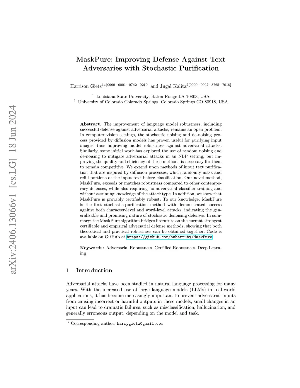 MaskPure: Improving Defense Against Text Adversaries with Stochastic
