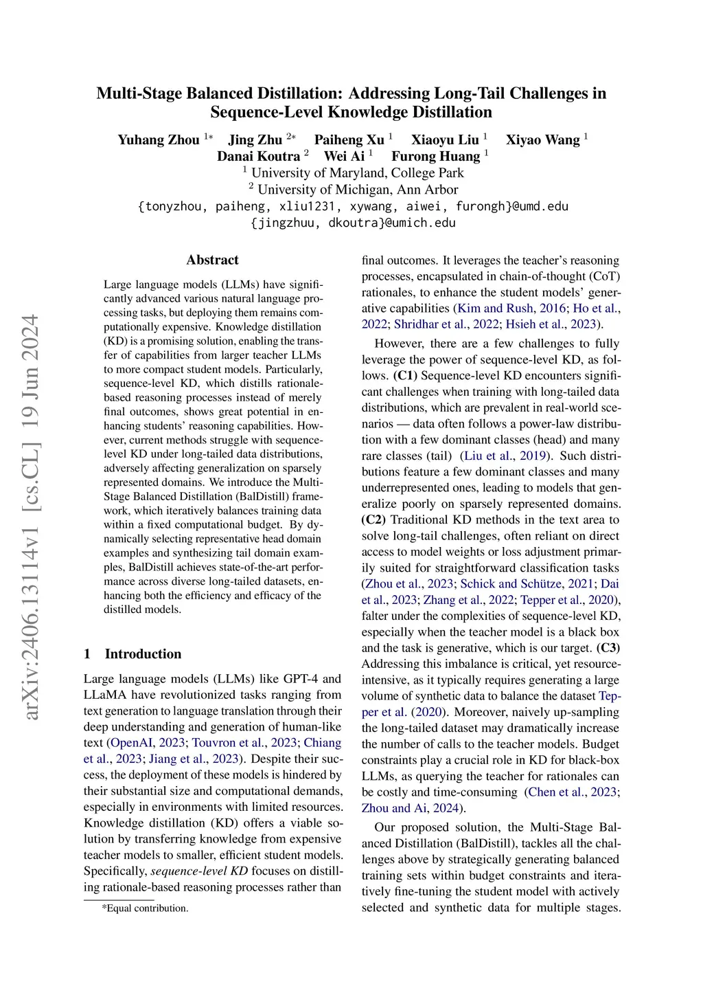 Large language models (LLMs) have significantly advanced various natural language processing tasks, but deploying them remains computationally expensive. Knowledge distillation (KD) is a promising solution, enabling the transfer of capabilities from larger teacher LLMs to more compact student models. Particularly, sequence-level KD, which distills rationale-based reasoning processes instead of merely final outcomes, shows great potential in enhancing students' reasoning capabilities. However, current methods struggle with sequence level KD under long-tailed data distributions, adversely affecting generalization on sparsely represented domains. We introduce the Multi-Stage Balanced Distillation (BalDistill) framework, which iteratively balances training data within a fixed computational budget. By dynamically selecting representative head domain examples and synthesizing tail domain examples, BalDistill achieves state-of-the-art performance across diverse long-tailed datasets, enhancing both the efficiency and efficacy of the distilled models.
