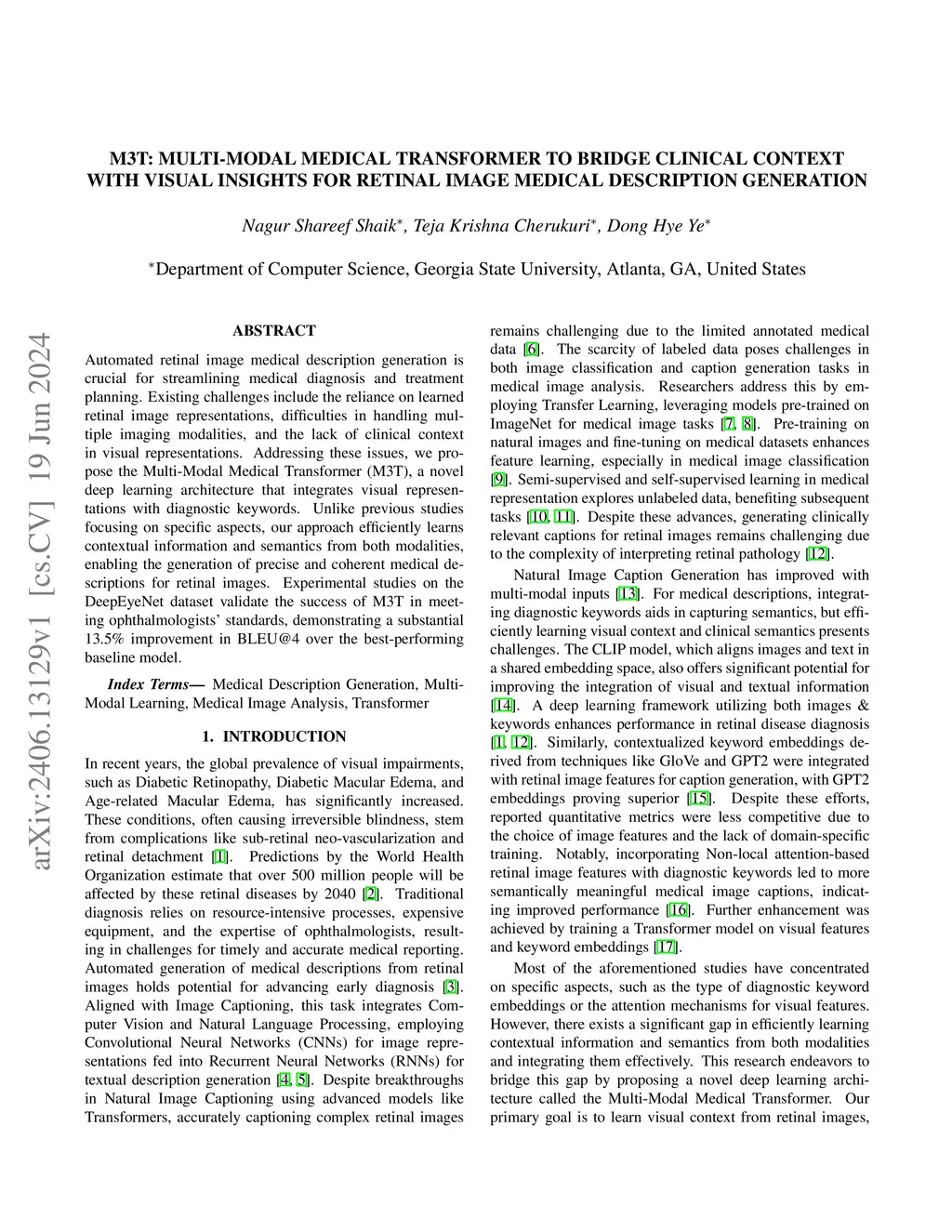 Automated retinal image medical description generation is crucial for streamlining medical diagnosis and treatment planning. Existing challenges include the reliance on learned retinal image representations, difficulties in handling multiple imaging modalities, and the lack of clinical context in visual representations. Addressing these issues, we propose the Multi-Modal Medical Transformer (M3T), a novel deep learning architecture that integrates visual representations with diagnostic keywords. Unlike previous studies focusing on specific aspects, our approach efficiently learns contextual information and semantics from both modalities, enabling the generation of precise and coherent medical descriptions for retinal images. Experimental studies on the DeepEyeNet dataset validate the success of M3T in meeting ophthalmologists' standards, demonstrating a substantial 13.5% improvement in BLEU@4 over the best-performing baseline model.