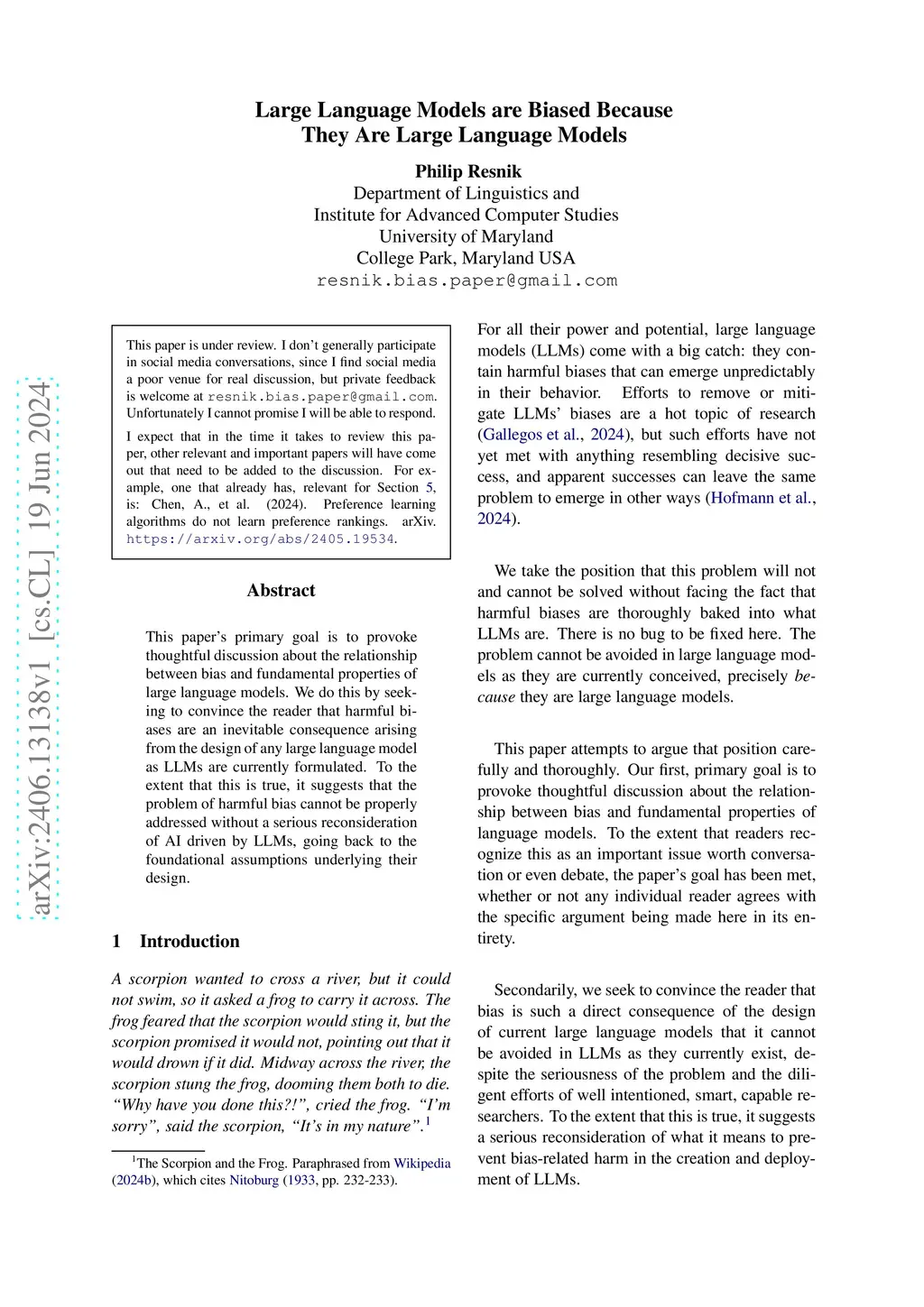 This position paper's primary goal is to provoke thoughtful discussion about the relationship between bias and fundamental properties of large language models. I do this by seeking to convince the reader that harmful biases are an inevitable consequence arising from the design of any large language model as LLMs are currently formulated. To the extent that this is true, it suggests that the problem of harmful bias cannot be properly addressed without a serious reconsideration of AI driven by LLMs, going back to the foundational assumptions underlying their design.
