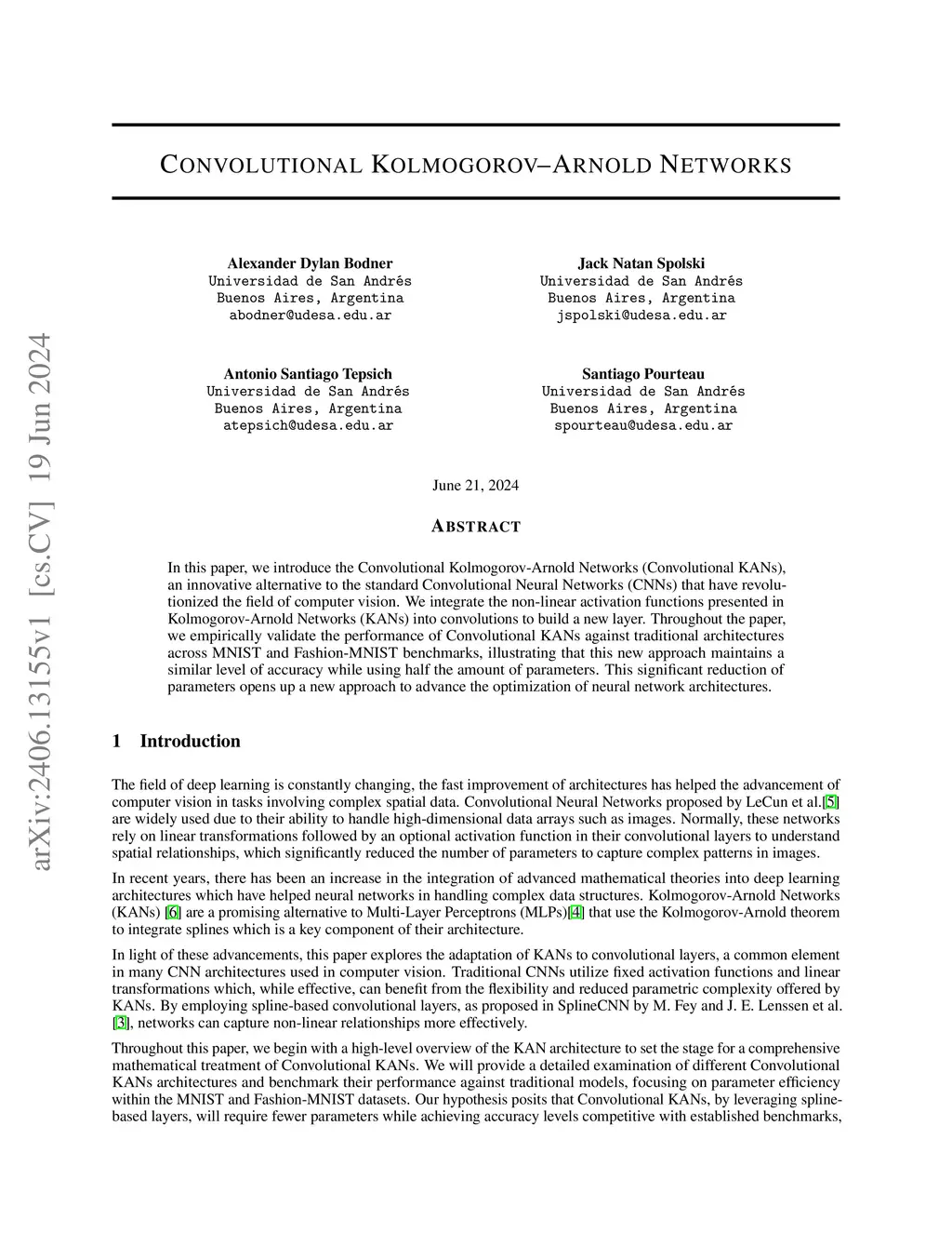 In this paper, we present Convolutional Kolmogorov-Arnold Networks, a novel architecture that integrates the learnable spline-based activation functions of Kolmogorov-Arnold Networks (KANs) into convolutional layers. By replacing traditional fixed-weight kernels with learnable non-linear functions, Convolutional KANs offer a significant improvement in parameter efficiency and expressive power over standard Convolutional Neural Networks (CNNs). We empirically evaluate Convolutional KANs on the Fashion-MNIST dataset, demonstrating competitive accuracy with up to 50% fewer parameters compared to baseline classic convolutions. This suggests that the KAN Convolution can effectively capture complex spatial relationships with fewer resources, offering a promising alternative for parameter-efficient deep learning models.