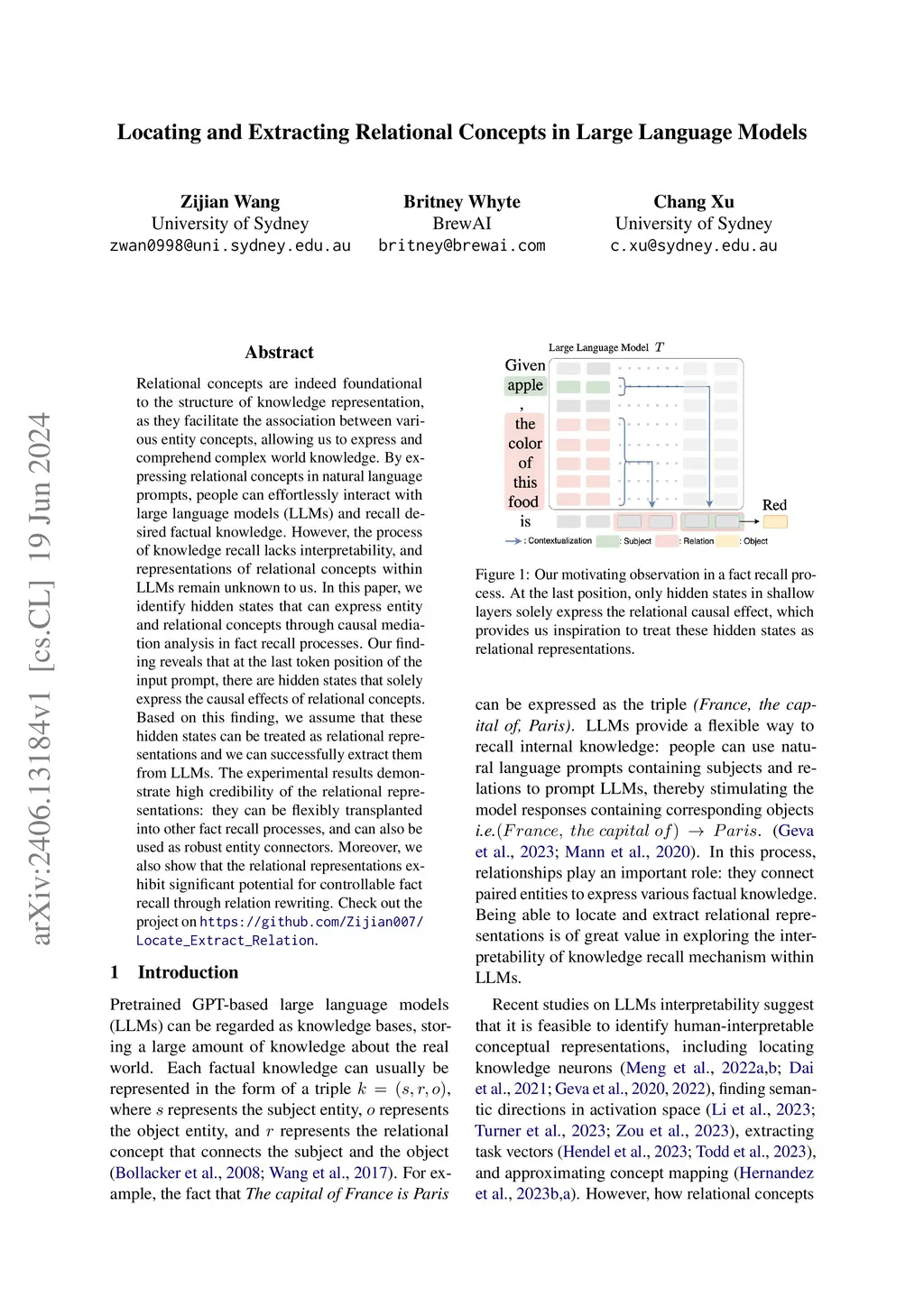 Relational concepts are indeed foundational to the structure of knowledge representation, as they facilitate the association between various entity concepts, allowing us to express and comprehend complex world knowledge. By expressing relational concepts in natural language prompts, people can effortlessly interact with large language models (LLMs) and recall desired factual knowledge. However, the process of knowledge recall lacks interpretability, and representations of relational concepts within LLMs remain unknown to us. In this paper, we identify hidden states that can express entity and relational concepts through causal mediation analysis in fact recall processes. Our finding reveals that at the last token position of the input prompt, there are hidden states that solely express the causal effects of relational concepts. Based on this finding, we assume that these hidden states can be treated as relational representations and we can successfully extract them from LLMs. The experimental results demonstrate high credibility of the relational representations: they can be flexibly transplanted into other fact recall processes, and can also be used as robust entity connectors. Moreover, we also show that the relational representations exhibit significant potential for controllable fact recall through relation rewriting.