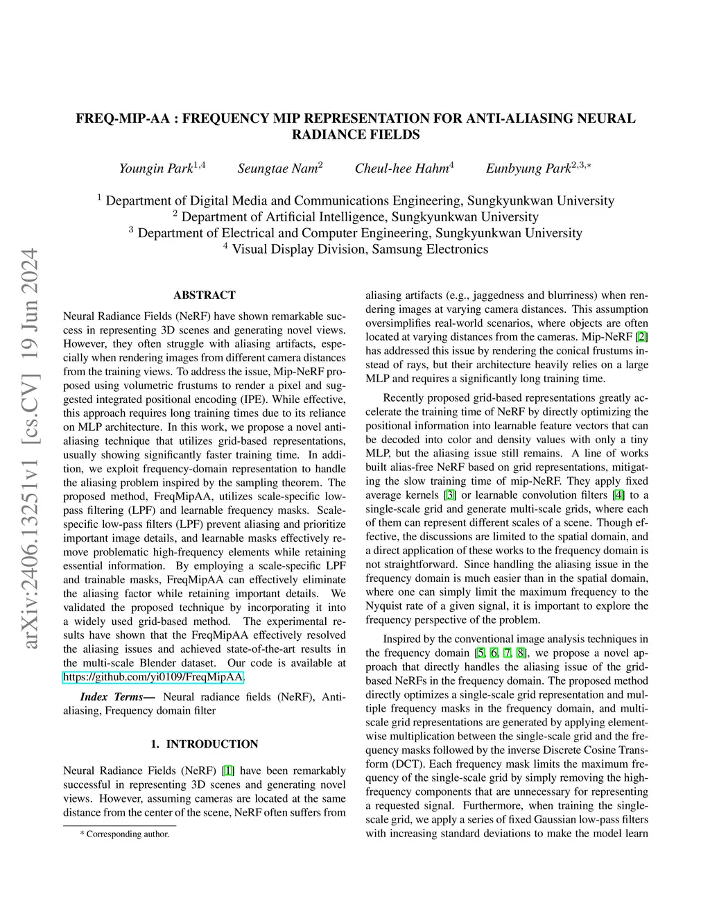 Neural Radiance Fields (NeRF) have shown remarkable success in representing 3D scenes and generating novel views. However, they often struggle with aliasing artifacts, especially when rendering images from different camera distances from the training views. To address the issue, Mip-NeRF proposed using volumetric frustums to render a pixel and suggested integrated positional encoding (IPE). While effective, this approach requires long training times due to its reliance on MLP architecture. In this work, we propose a novel anti-aliasing technique that utilizes grid-based representations, usually showing significantly faster training time. In addition, we exploit frequency-domain representation to handle the aliasing problem inspired by the sampling theorem. The proposed method, FreqMipAA, utilizes scale-specific low-pass filtering (LPF) and learnable frequency masks. Scale-specific low-pass filters (LPF) prevent aliasing and prioritize important image details, and learnable masks effectively remove problematic high-frequency elements while retaining essential information. By employing a scale-specific LPF and trainable masks, FreqMipAA can effectively eliminate the aliasing factor while retaining important details. We validated the proposed technique by incorporating it into a widely used grid-based method. The experimental results have shown that the FreqMipAA effectively resolved the aliasing issues and achieved state-of-the-art results in the multi-scale Blender dataset. Our code is available at https://github.com/yi0109/FreqMipAA .