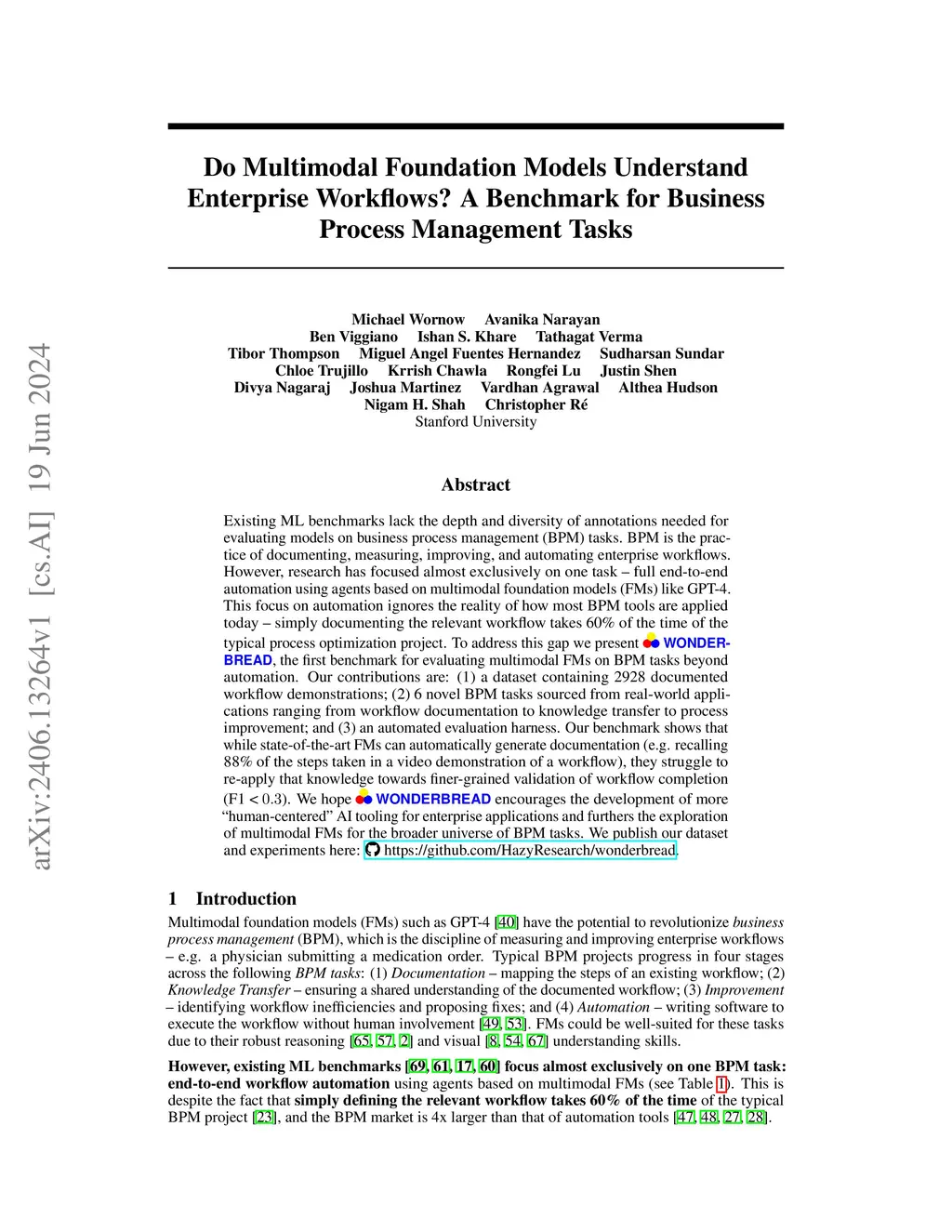 Existing ML benchmarks lack the depth and diversity of annotations needed for evaluating models on business process management (BPM) tasks. BPM is the practice of documenting, measuring, improving, and automating enterprise workflows. However, research has focused almost exclusively on one task - full end-to-end automation using agents based on multimodal foundation models (FMs) like GPT-4. This focus on automation ignores the reality of how most BPM tools are applied today - simply documenting the relevant workflow takes 60% of the time of the typical process optimization project. To address this gap we present WONDERBREAD, the first benchmark for evaluating multimodal FMs on BPM tasks beyond automation. Our contributions are: (1) a dataset containing 2928 documented workflow demonstrations; (2) 6 novel BPM tasks sourced from real-world applications ranging from workflow documentation to knowledge transfer to process improvement; and (3) an automated evaluation harness. Our benchmark shows that while state-of-the-art FMs can automatically generate documentation (e.g. recalling 88% of the steps taken in a video demonstration of a workflow), they struggle to re-apply that knowledge towards finer-grained validation of workflow completion (F1 < 0.3). We hope WONDERBREAD encourages the development of more "human-centered" AI tooling for enterprise applications and furthers the exploration of multimodal FMs for the broader universe of BPM tasks. We publish our dataset and experiments here: https://github.com/HazyResearch/wonderbread