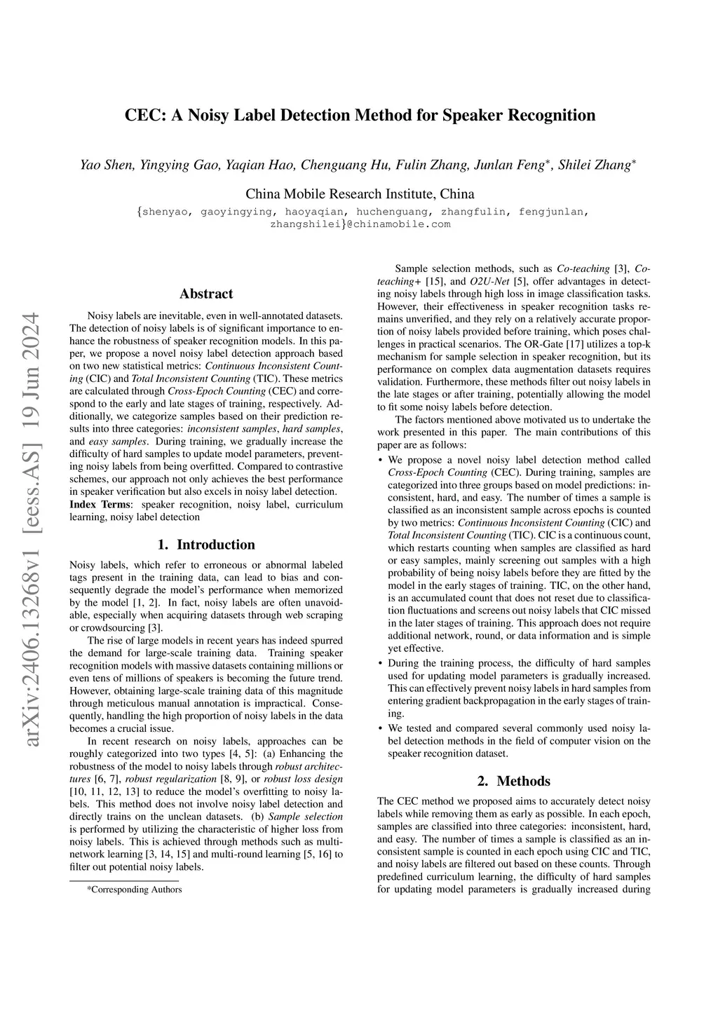 CEC: A Noisy Label Detection Method for Speaker Recognition