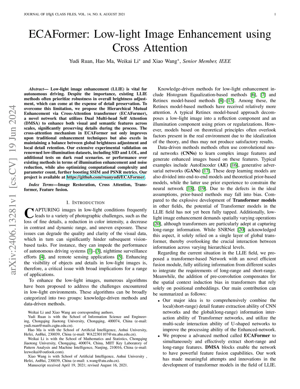 ECAFormer: Low-light Image Enhancement using Cross Attention