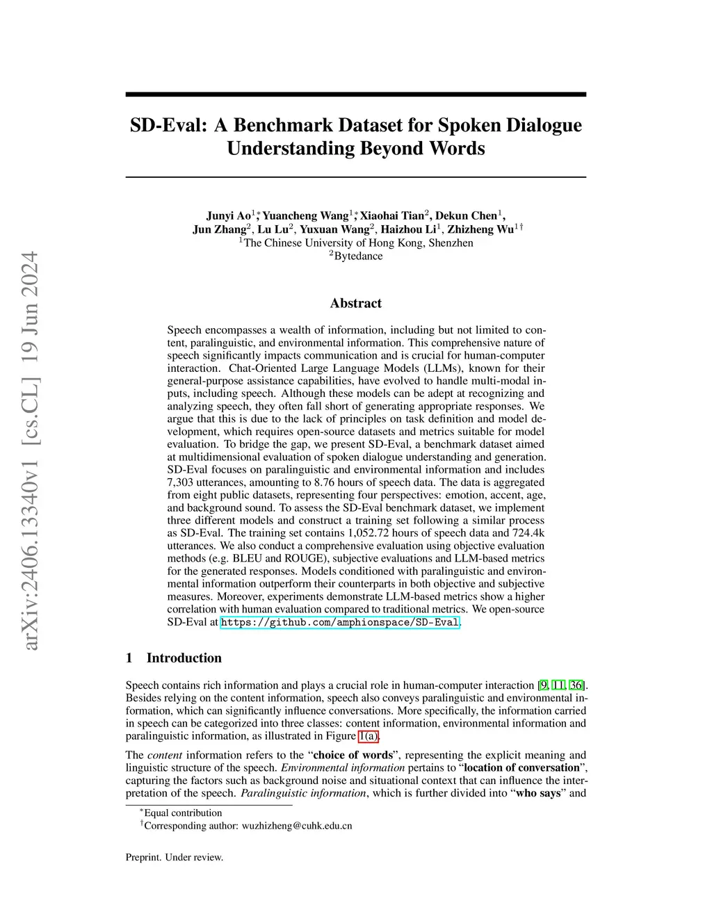 SD-Eval: A Benchmark Dataset for Spoken Dialogue Understanding Beyond Words