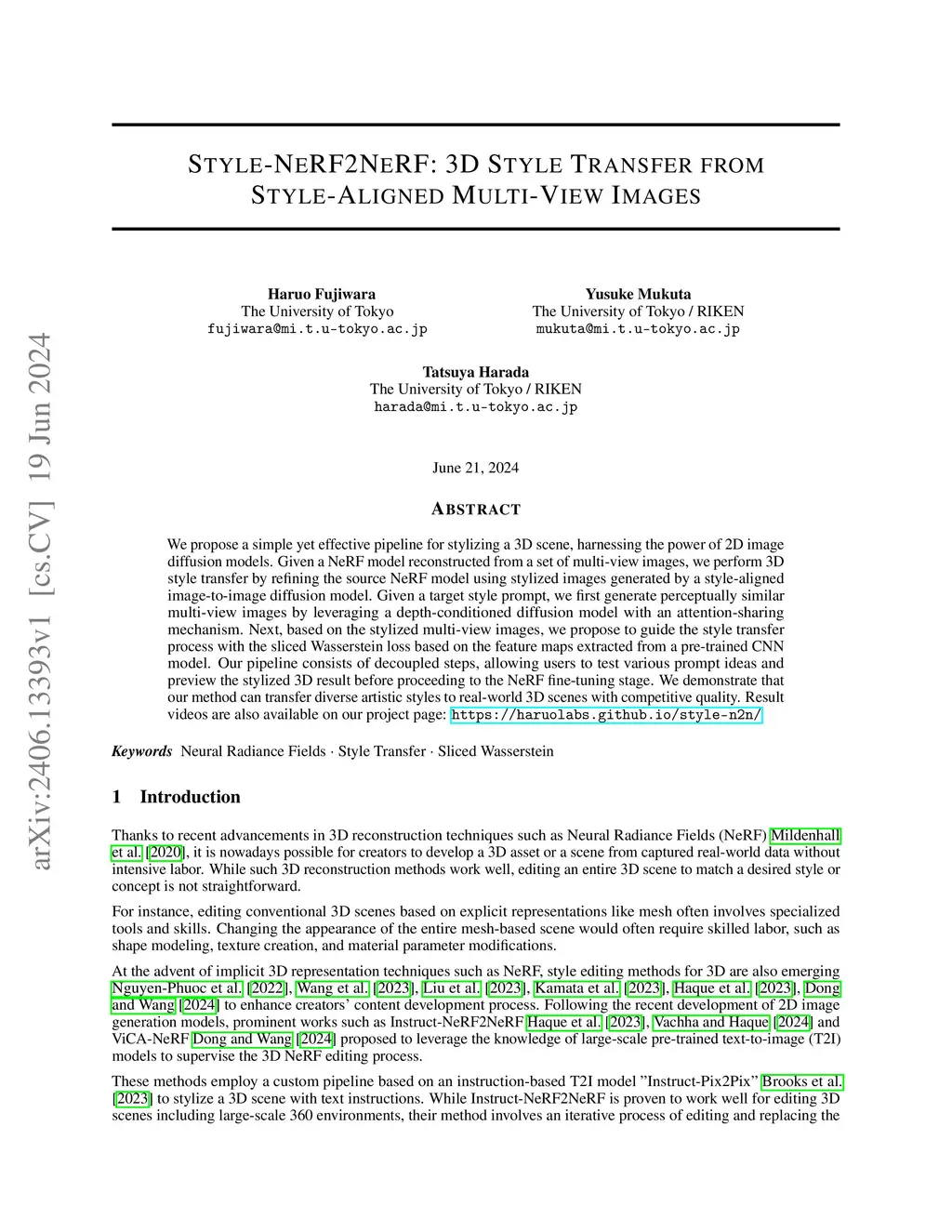 We propose a simple yet effective pipeline for stylizing a 3D scene, harnessing the power of 2D image diffusion models. Given a NeRF model reconstructed from a set of multi-view images, we perform 3D style transfer by refining the source NeRF model using stylized images generated by a style-aligned image-to-image diffusion model. Given a target style prompt, we first generate perceptually similar multi-view images by leveraging a depth-conditioned diffusion model with an attention-sharing mechanism. Next, based on the stylized multi-view images, we propose to guide the style transfer process with the sliced Wasserstein loss based on the feature maps extracted from a pre-trained CNN model. Our pipeline consists of decoupled steps, allowing users to test various prompt ideas and preview the stylized 3D result before proceeding to the NeRF fine-tuning stage. We demonstrate that our method can transfer diverse artistic styles to real-world 3D scenes with competitive quality. Result videos are also available on our project page: https://haruolabs.github.io/style-n2n/