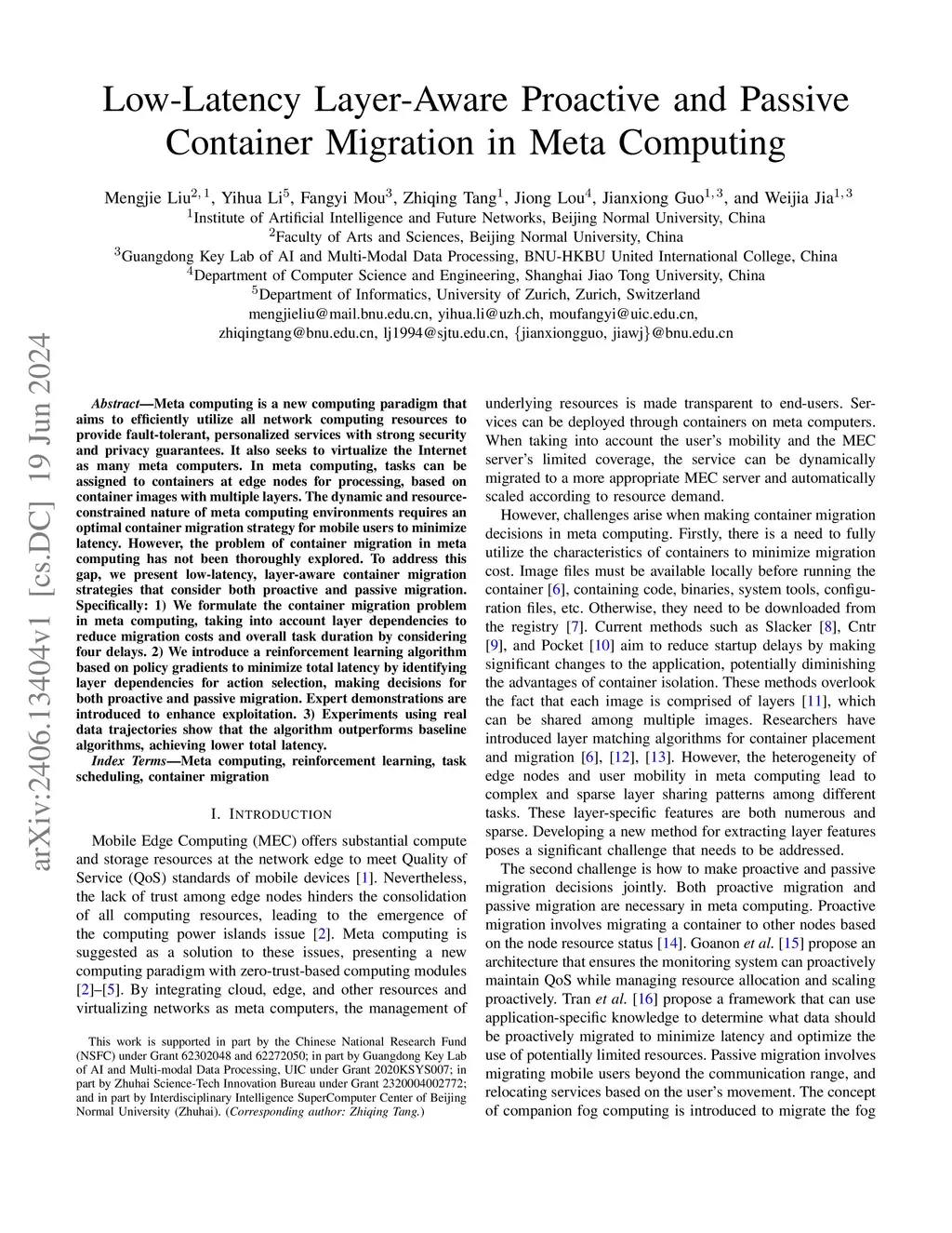 Meta computing is a new computing paradigm that aims to efficiently utilize all network computing resources to provide fault-tolerant, personalized services with strong security and privacy guarantees. It also seeks to virtualize the Internet as many meta computers. In meta computing, tasks can be assigned to containers at edge nodes for processing, based on container images with multiple layers. The dynamic and resource-constrained nature of meta computing environments requires an optimal container migration strategy for mobile users to minimize latency. However, the problem of container migration in meta computing has not been thoroughly explored. To address this gap, we present low-latency, layer-aware container migration strategies that consider both proactive and passive migration. Specifically: 1) We formulate the container migration problem in meta computing, taking into account layer dependencies to reduce migration costs and overall task duration by considering four delays. 2) We introduce a reinforcement learning algorithm based on policy gradients to minimize total latency by identifying layer dependencies for action selection, making decisions for both proactive and passive migration. Expert demonstrations are introduced to enhance exploitation. 3) Experiments using real data trajectories show that the algorithm outperforms baseline algorithms, achieving lower total latency.