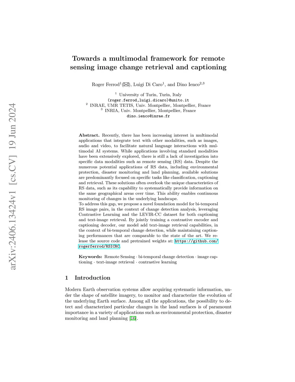 Recently, there has been increasing interest in multimodal applications that integrate text with other modalities, such as images, audio and video, to facilitate natural language interactions with multimodal AI systems. While applications involving standard modalities have been extensively explored, there is still a lack of investigation into specific data modalities such as remote sensing (RS) data. Despite the numerous potential applications of RS data, including environmental protection, disaster monitoring and land planning, available solutions are predominantly focused on specific tasks like classification, captioning and retrieval. These solutions often overlook the unique characteristics of RS data, such as its capability to systematically provide information on the same geographical areas over time. This ability enables continuous monitoring of changes in the underlying landscape. To address this gap, we propose a novel foundation model for bi-temporal RS image pairs, in the context of change detection analysis, leveraging Contrastive Learning and the LEVIR-CC dataset for both captioning and text-image retrieval. By jointly training a contrastive encoder and captioning decoder, our model add text-image retrieval capabilities, in the context of bi-temporal change detection, while maintaining captioning performances that are comparable to the state of the art. We release the source code and pretrained weights at: https://github.com/rogerferrod/RSICRC.