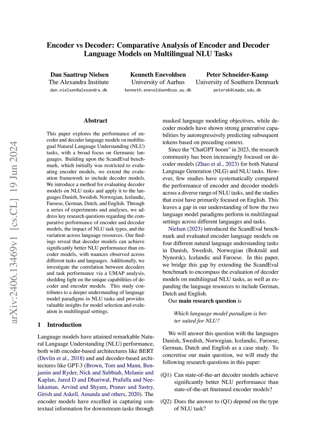 This paper explores the performance of encoder and decoder language models on multilingual Natural Language Understanding (NLU) tasks, with a broad focus on Germanic languages. Building upon the ScandEval benchmark, initially restricted to evaluating encoder models, we extend the evaluation framework to include decoder models. We introduce a method for evaluating decoder models on NLU tasks and apply it to the languages Danish, Swedish, Norwegian, Icelandic, Faroese, German, Dutch, and English. Through a series of experiments and analyses, we also address research questions regarding the comparative performance of encoder and decoder models, the impact of NLU task types, and the variation across language resources. Our findings reveal that encoder models can achieve significantly better NLU performance than decoder models despite having orders of magnitude fewer parameters. Additionally, we investigate the correlation between decoders and task performance via a UMAP analysis, shedding light on the unique capabilities of decoder and encoder models. This study contributes to a deeper understanding of language model paradigms in NLU tasks and provides valuable insights for model selection and evaluation in multilingual settings.