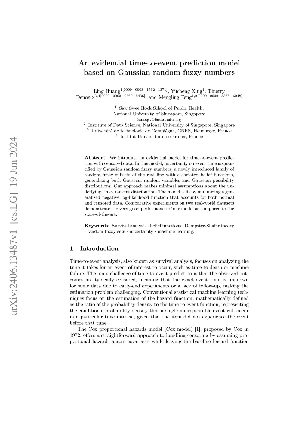 We introduce an evidential model for time-to-event prediction with censored data. In this model, uncertainty on event time is quantified by Gaussian random fuzzy numbers, a newly introduced family of random fuzzy subsets of the real line with associated belief functions, generalizing both Gaussian random variables and Gaussian possibility distributions. Our approach makes minimal assumptions about the underlying time-to-event distribution. The model is fit by minimizing a generalized negative log-likelihood function that accounts for both normal and censored data. Comparative experiments on two real-world datasets demonstrate the very good performance of our model as compared to the state-of-the-art.