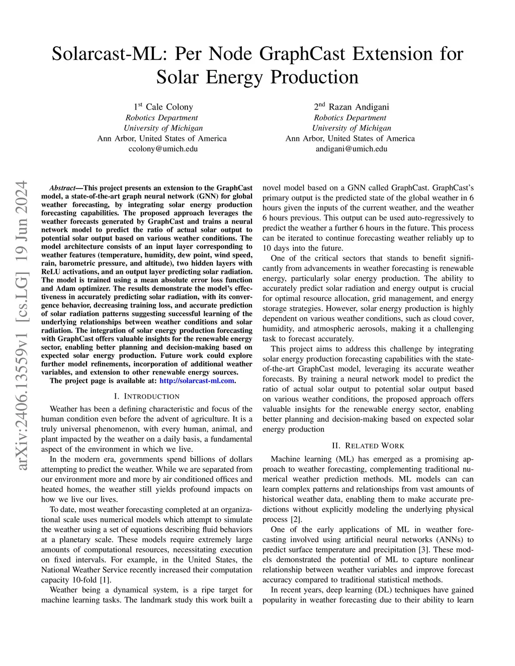 This project presents an extension to the GraphCast model, a state-of-the-art graph neural network (GNN) for global weather forecasting, by integrating solar energy production forecasting capabilities. The proposed approach leverages the weather forecasts generated by GraphCast and trains a neural network model to predict the ratio of actual solar output to potential solar output based on various weather conditions. The model architecture consists of an input layer corresponding to weather features (temperature, humidity, dew point, wind speed, rain, barometric pressure, and altitude), two hidden layers with ReLU activations, and an output layer predicting solar radiation. The model is trained using a mean absolute error loss function and Adam optimizer. The results demonstrate the model's effectiveness in accurately predicting solar radiation, with its convergence behavior, decreasing training loss, and accurate prediction of solar radiation patterns suggesting successful learning of the underlying relationships between weather conditions and solar radiation. The integration of solar energy production forecasting with GraphCast offers valuable insights for the renewable energy sector, enabling better planning and decision-making based on expected solar energy production. Future work could explore further model refinements, incorporation of additional weather variables, and extension to other renewable energy sources.