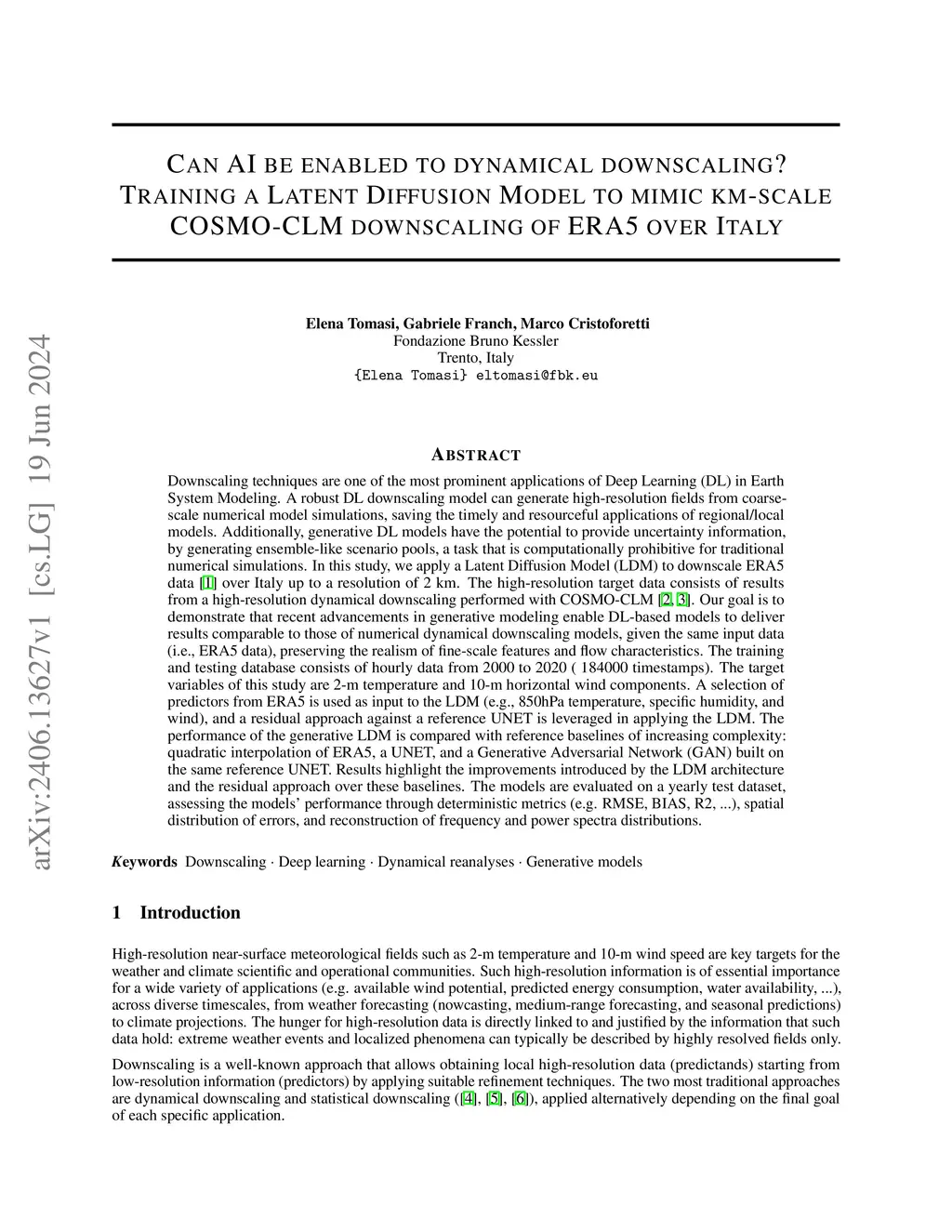 Downscaling techniques are one of the most prominent applications of Deep Learning (DL) in Earth System Modeling. A robust DL downscaling model can generate high-resolution fields from coarse-scale numerical model simulations, saving the timely and resourceful applications of regional/local models. Additionally, generative DL models have the potential to provide uncertainty information, by generating ensemble-like scenario pools, a task that is computationally prohibitive for traditional numerical simulations. In this study, we apply a Latent Diffusion Model (LDM) to downscale ERA5 data over Italy up to a resolution of 2 km. The high-resolution target data consists of 2-m temperature and 10-m horizontal wind components from a dynamical downscaling performed with COSMO_CLM. Our goal is to demonstrate that recent advancements in generative modeling enable DL to deliver results comparable to those of numerical dynamical models, given the same input data, preserving the realism of fine-scale features and flow characteristics. A selection of predictors from ERA5 is used as input to the LDM, and a residual approach against a reference UNET is leveraged in applying the LDM. The performance of the generative LDM is compared with reference baselines of increasing complexity: quadratic interpolation of ERA5, a UNET, and a Generative Adversarial Network (GAN) built on the same reference UNET. Results highlight the improvements introduced by the LDM architecture and the residual approach over these baselines. The models are evaluated on a yearly test dataset, assessing the models' performance through deterministic metrics, spatial distribution of errors, and reconstruction of frequency and power spectra distributions.