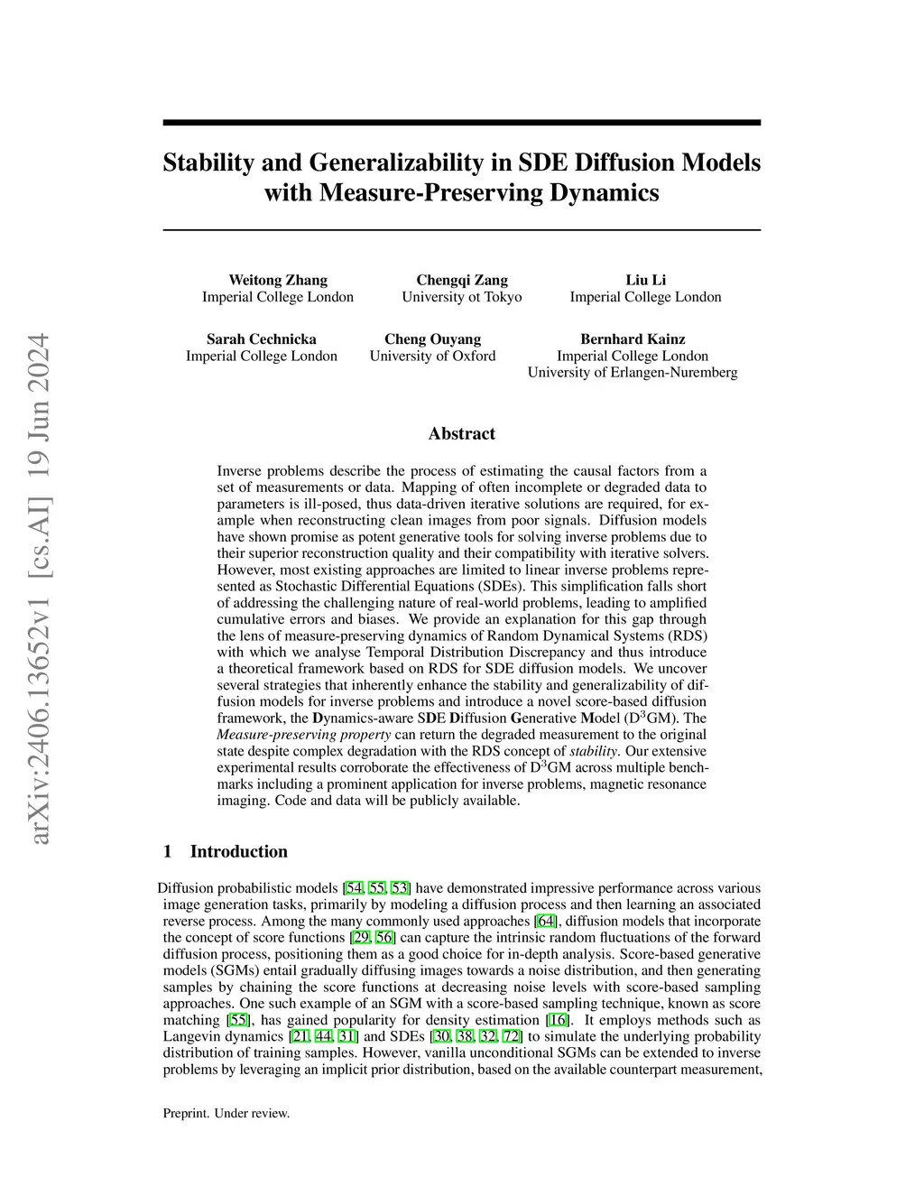 Inverse problems describe the process of estimating the causal factors from a set of measurements or data. Mapping of often incomplete or degraded data to parameters is ill-posed, thus data-driven iterative solutions are required, for example when reconstructing clean images from poor signals. Diffusion models have shown promise as potent generative tools for solving inverse problems due to their superior reconstruction quality and their compatibility with iterative solvers. However, most existing approaches are limited to linear inverse problems represented as Stochastic Differential Equations (SDEs). This simplification falls short of addressing the challenging nature of real-world problems, leading to amplified cumulative errors and biases. We provide an explanation for this gap through the lens of measure-preserving dynamics of Random Dynamical Systems (RDS) with which we analyse Temporal Distribution Discrepancy and thus introduce a theoretical framework based on RDS for SDE diffusion models. We uncover several strategies that inherently enhance the stability and generalizability of diffusion models for inverse problems and introduce a novel score-based diffusion framework, the \textbf{D}ynamics-aware S\textbf{D}E \textbf{D}iffusion \textbf{G}enerative \textbf{M}odel (DGM). The \textit{Measure-preserving property} can return the degraded measurement to the original state despite complex degradation with the RDS concept of \textit{stability}. Our extensive experimental results corroborate the effectiveness of DGM across multiple benchmarks including a prominent application for inverse problems, magnetic resonance imaging. Code and data will be publicly available.