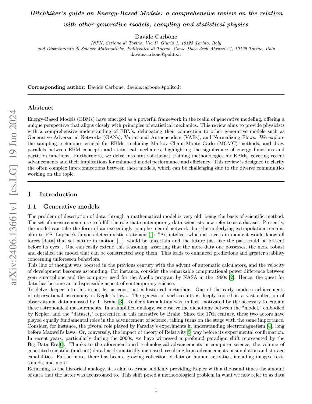 Energy-Based Models have emerged as a powerful framework in the realm of generative modeling, offering a unique perspective that aligns closely with principles of statistical mechanics. This review aims to provide physicists with a comprehensive understanding of EBMs, delineating their connection to other generative models such as Generative Adversarial Networks, Variational Autoencoders, and Normalizing Flows. We explore the sampling techniques crucial for EBMs, including Markov Chain Monte Carlo (MCMC) methods, and draw parallels between EBM concepts and statistical mechanics, highlighting the significance of energy functions and partition functions. Furthermore, we delve into recent training methodologies for EBMs, covering recent advancements and their implications for enhanced model performance and efficiency. This review is designed to clarify the often complex interconnections between these models, which can be challenging due to the diverse communities working on the topic.
