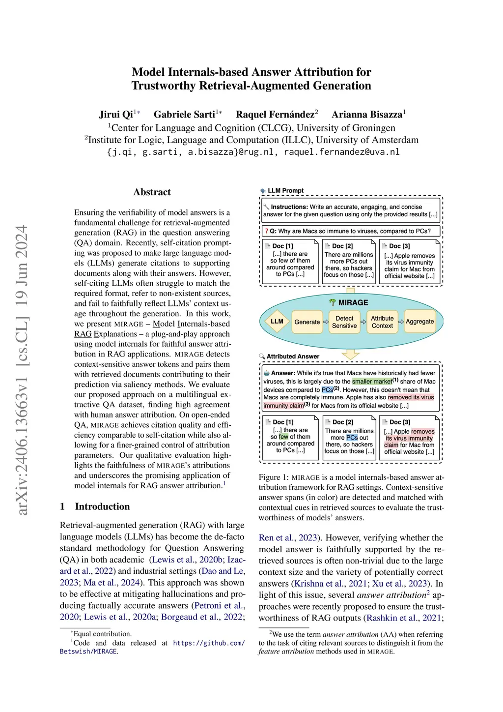 Ensuring the verifiability of model answers is a fundamental challenge for retrieval-augmented generation (RAG) in the question answering (QA) domain. Recently, self-citation prompting was proposed to make large language models (LLMs) generate citations to supporting documents along with their answers. However, self-citing LLMs often struggle to match the required format, refer to non-existent sources, and fail to faithfully reflect LLMs' context usage throughout the generation. In this work, we present MIRAGE --Model Internals-based RAG Explanations -- a plug-and-play approach using model internals for faithful answer attribution in RAG applications. MIRAGE detects context-sensitive answer tokens and pairs them with retrieved documents contributing to their prediction via saliency methods. We evaluate our proposed approach on a multilingual extractive QA dataset, finding high agreement with human answer attribution. On open-ended QA, MIRAGE achieves citation quality and efficiency comparable to self-citation while also allowing for a finer-grained control of attribution parameters. Our qualitative evaluation highlights the faithfulness of MIRAGE's attributions and underscores the promising application of model internals for RAG answer attribution.