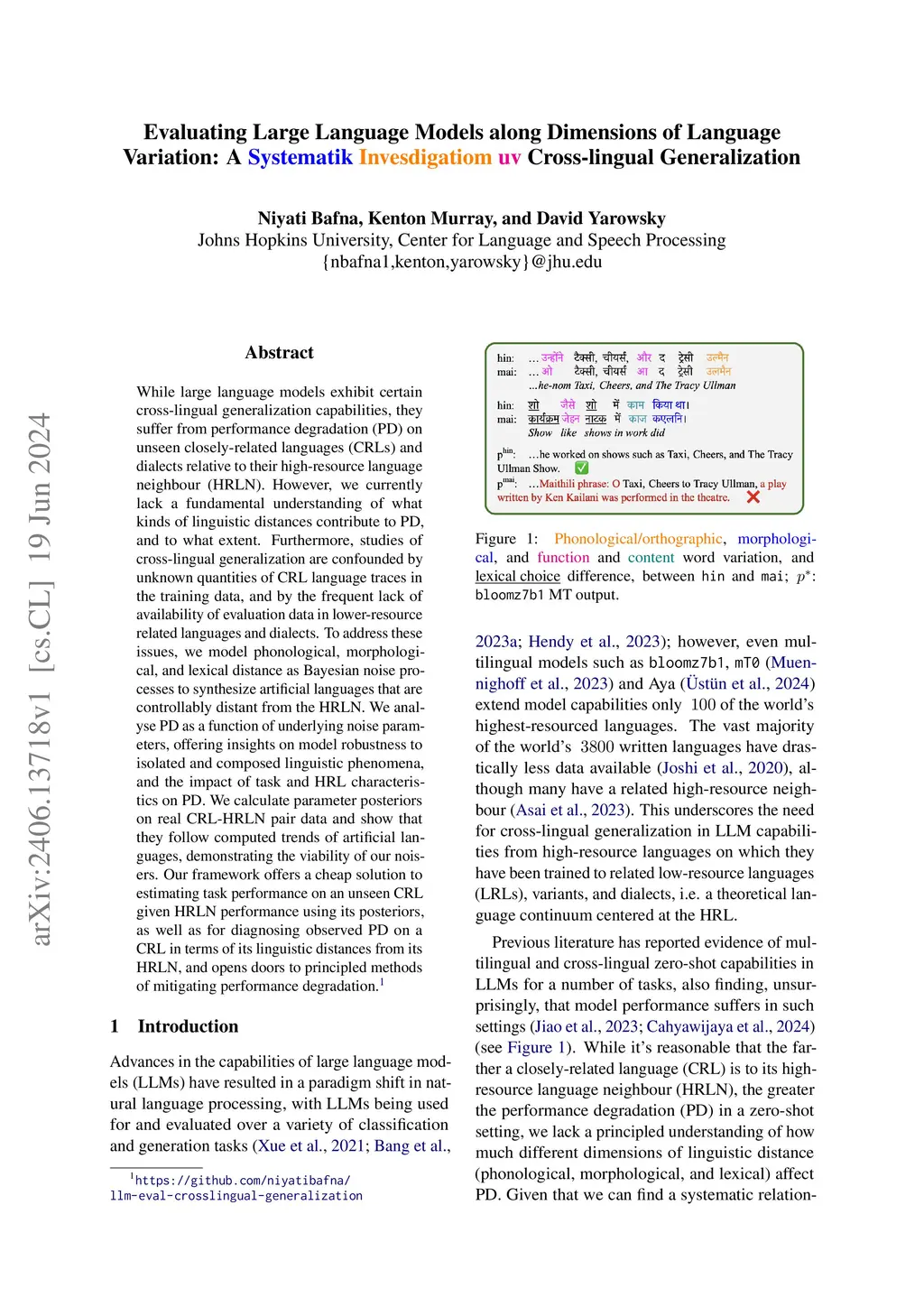 While large language models exhibit certain cross-lingual generalization capabilities, they suffer from performance degradation (PD) on unseen closely-related languages (CRLs) and dialects relative to their high-resource language neighbour (HRLN). However, we currently lack a fundamental understanding of what kinds of linguistic distances contribute to PD, and to what extent. Furthermore, studies of cross-lingual generalization are confounded by unknown quantities of CRL language traces in the training data, and by the frequent lack of availability of evaluation data in lower-resource related languages and dialects. To address these issues, we model phonological, morphological, and lexical distance as Bayesian noise processes to synthesize artificial languages that are controllably distant from the HRLN. We analyse PD as a function of underlying noise parameters, offering insights on model robustness to isolated and composed linguistic phenomena, and the impact of task and HRL characteristics on PD. We calculate parameter posteriors on real CRL-HRLN pair data and show that they follow computed trends of artificial languages, demonstrating the viability of our noisers. Our framework offers a cheap solution for estimating task performance on an unseen CRL given HRLN performance using its posteriors, as well as for diagnosing observed PD on a CRL in terms of its linguistic distances from its HRLN, and opens doors to principled methods of mitigating performance degradation.